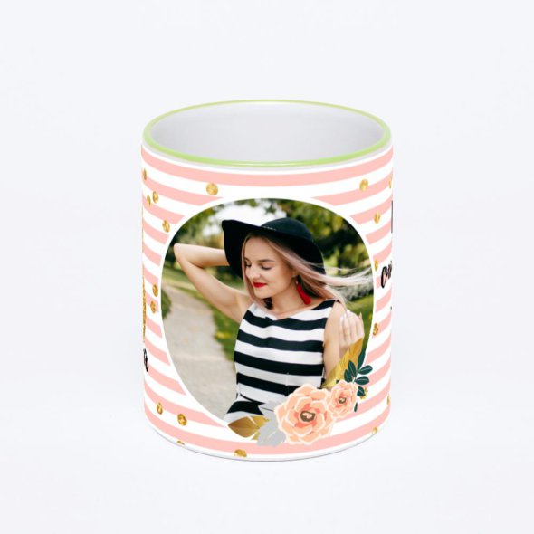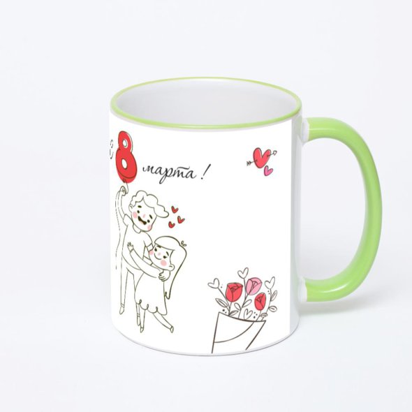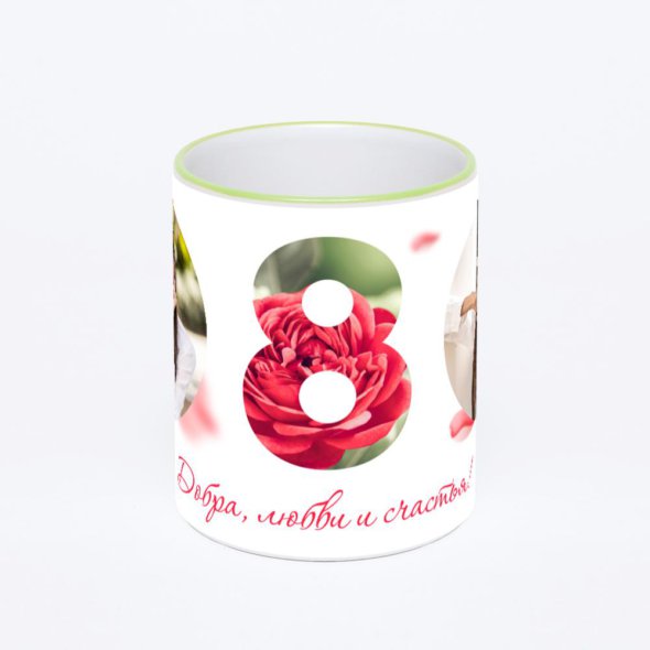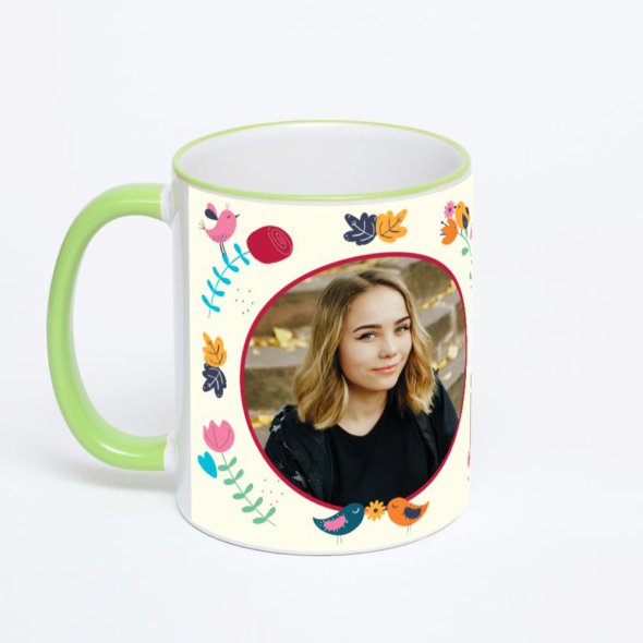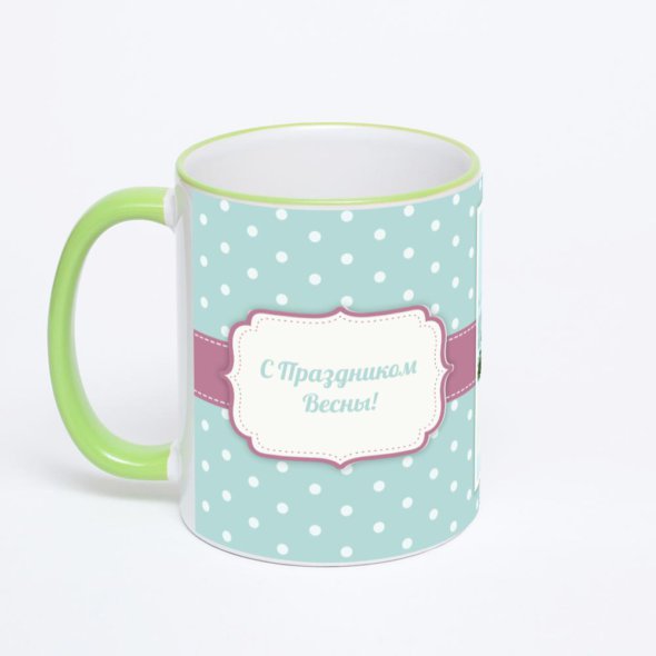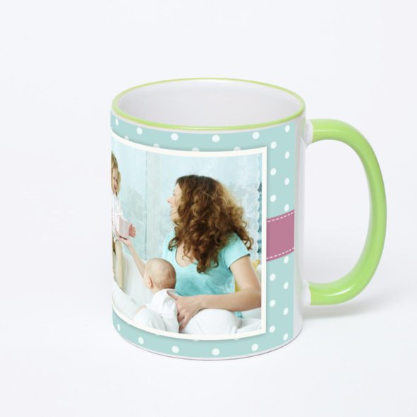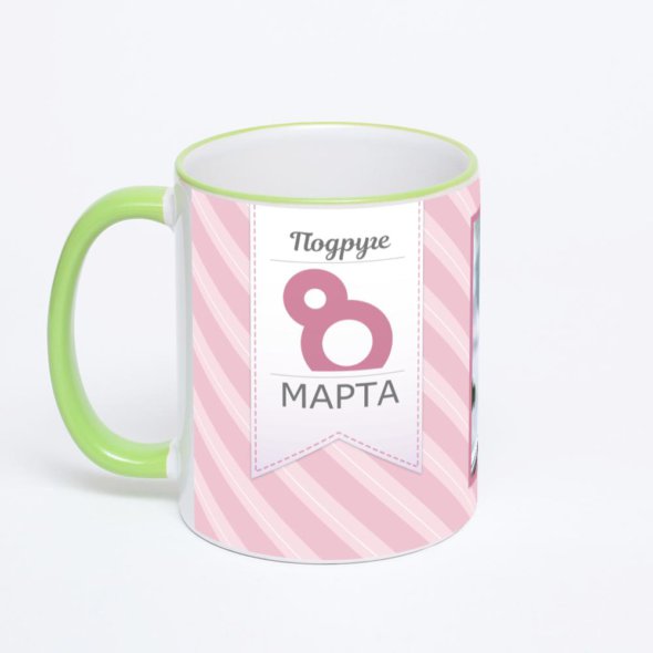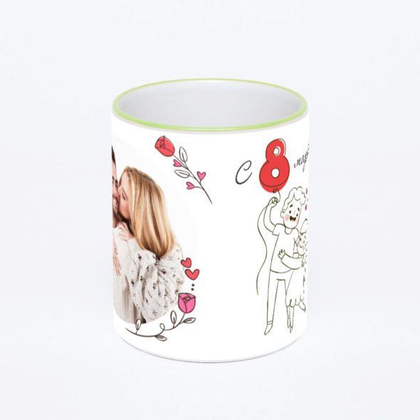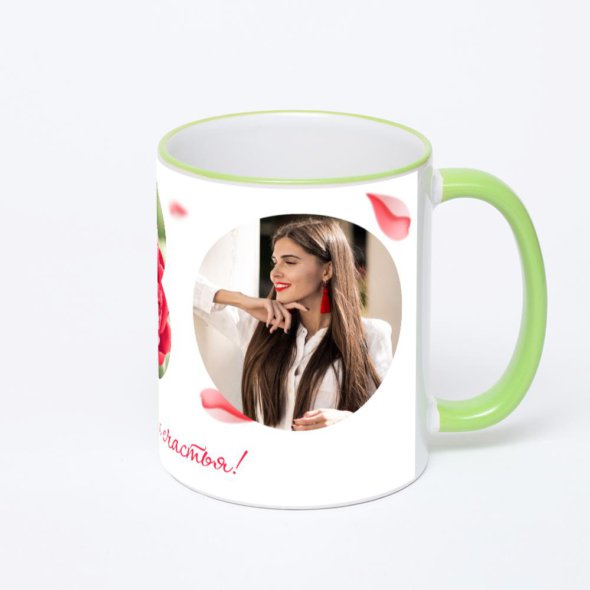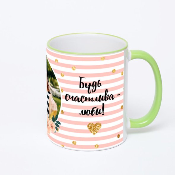 Керамическая кружка с салатовой ручкой и ободком с нанесением изображения. Кружка с вашим изображением – это уникальный и качественный подарок. Создать её вы можете прямо сейчас в редакторе, добавляя фотографии, стикеры и надписи.