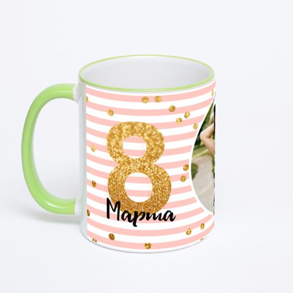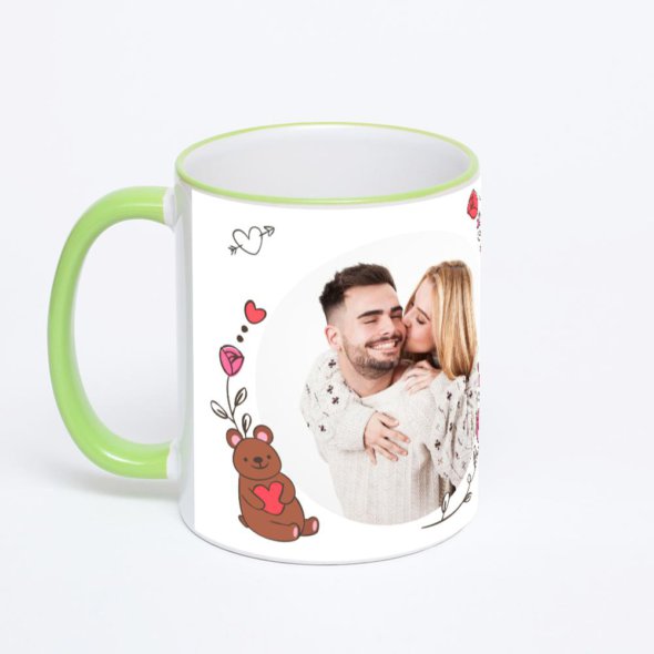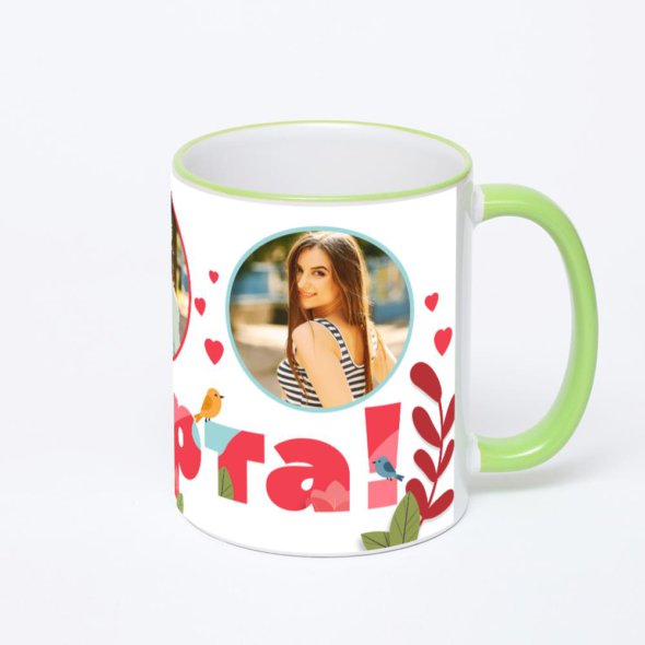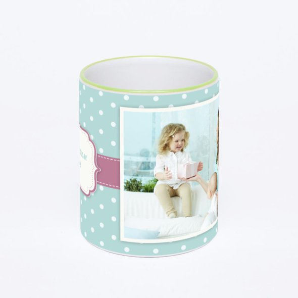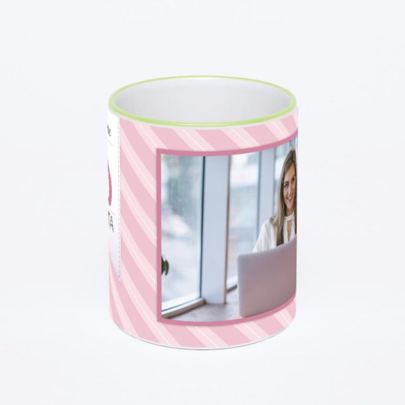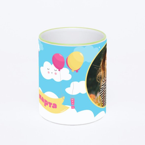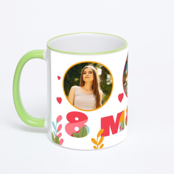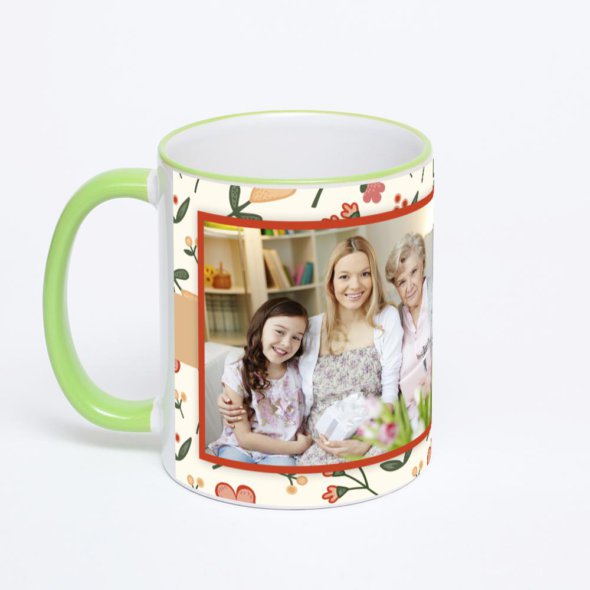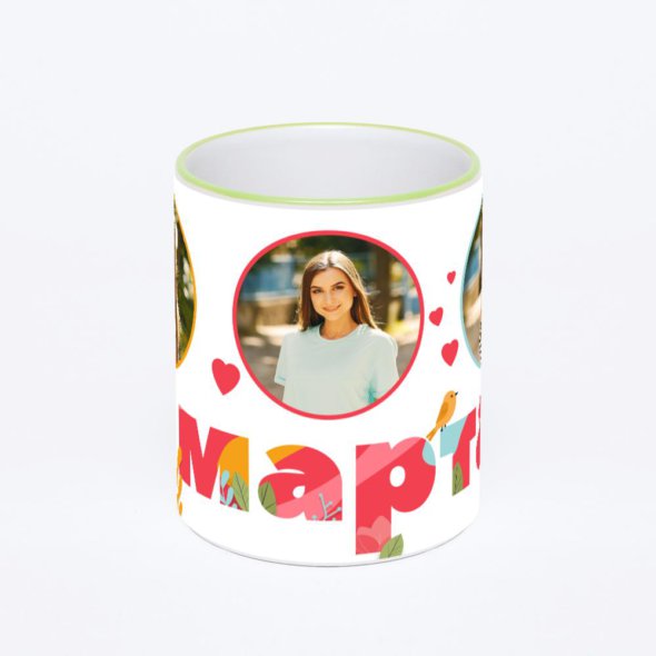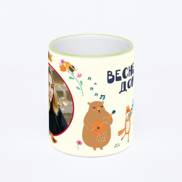 Керамическая кружка с салатовой ручкой и ободком с нанесением изображения. Кружка с вашим изображением – это уникальный и качественный подарок. Создать её вы можете прямо сейчас в редакторе, добавляя фотографии, стикеры и надписи.