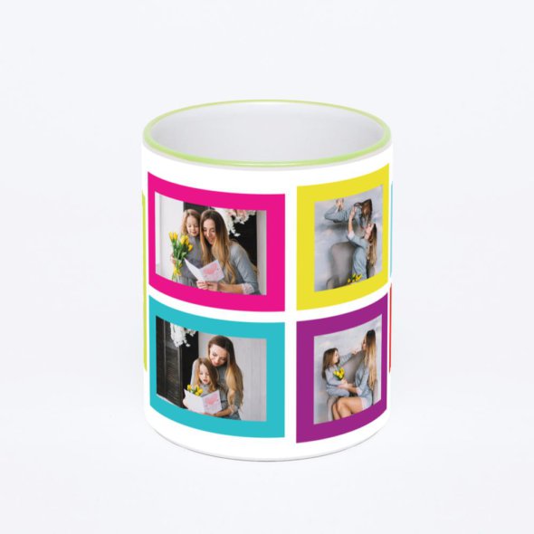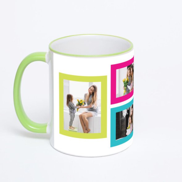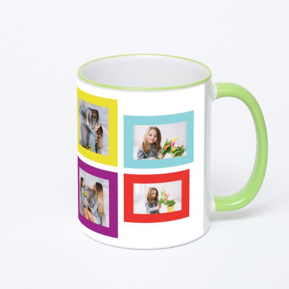 Керамическая кружка с салатовой ручкой и ободком с нанесением изображения. Кружка с вашим изображением – это уникальный и качественный подарок. Создать её вы можете прямо сейчас в редакторе, добавляя фотографии, стикеры и надписи.