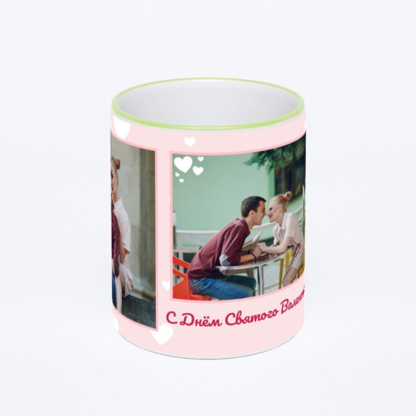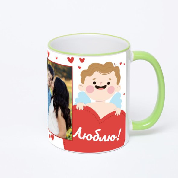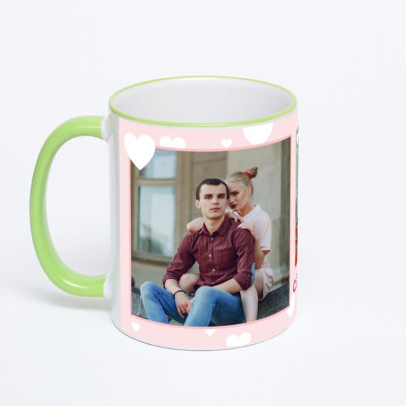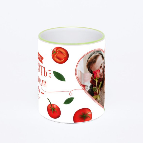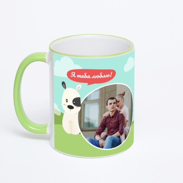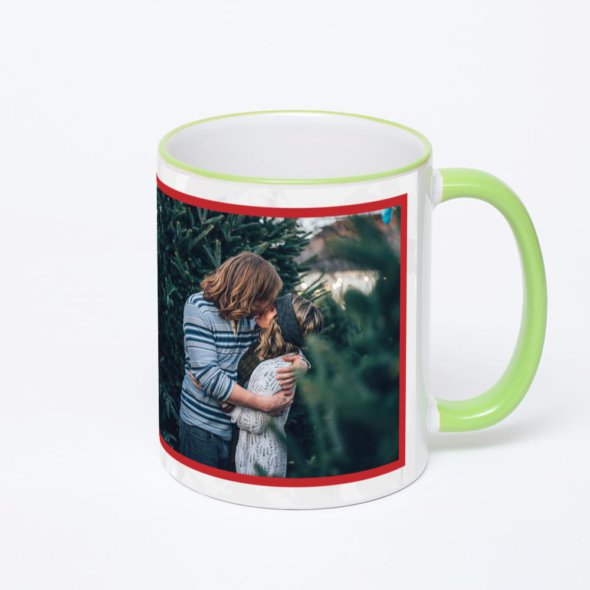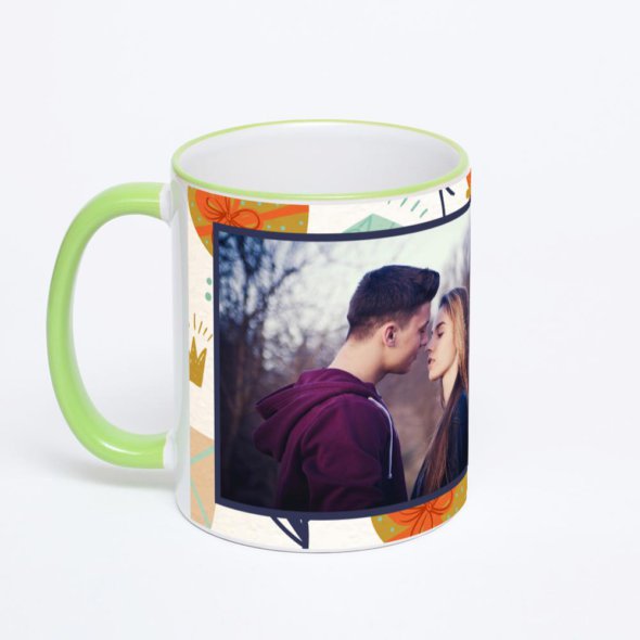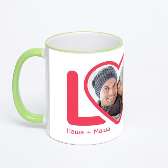 Керамическая кружка с салатовой ручкой и ободком с нанесением изображения. Кружка с вашим изображением – это уникальный и качественный подарок. Создать её вы можете прямо сейчас в редакторе, добавляя фотографии, стикеры и надписи.
