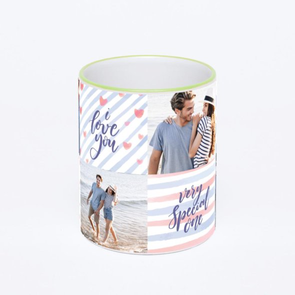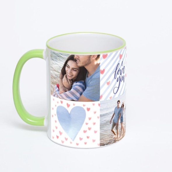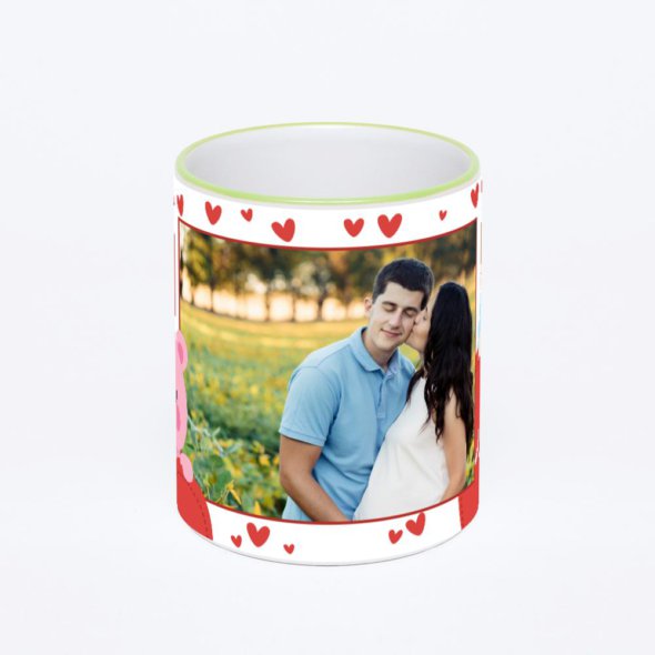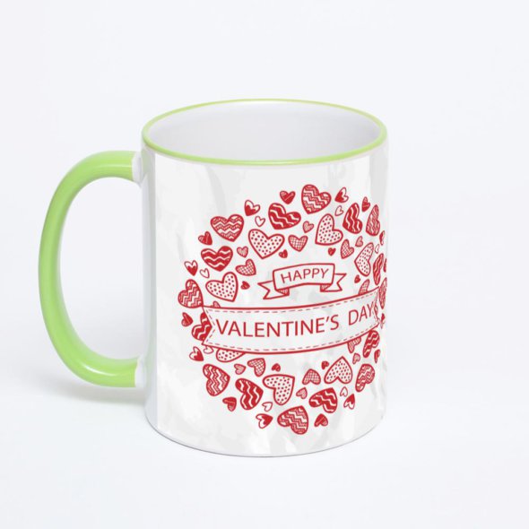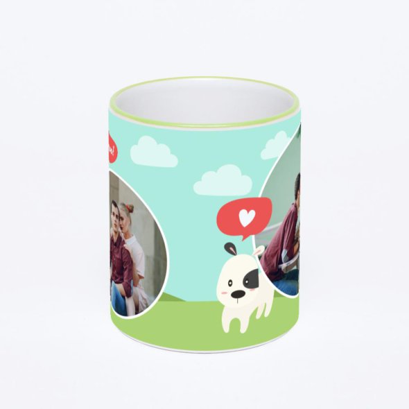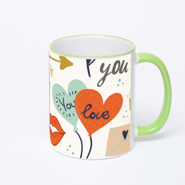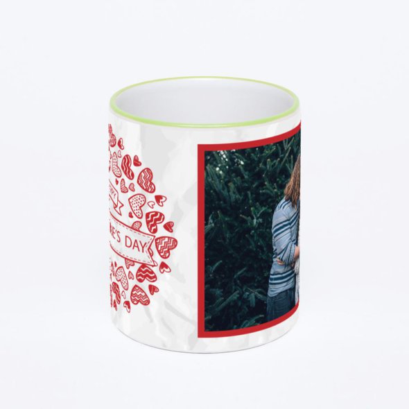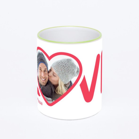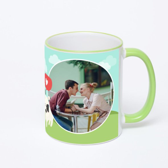 Керамическая кружка с салатовой ручкой и ободком с нанесением изображения. Кружка с вашим изображением – это уникальный и качественный подарок. Создать её вы можете прямо сейчас в редакторе, добавляя фотографии, стикеры и надписи.