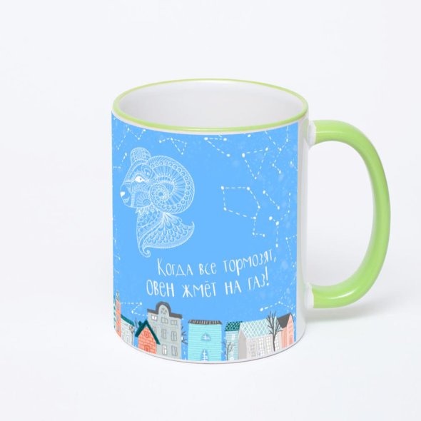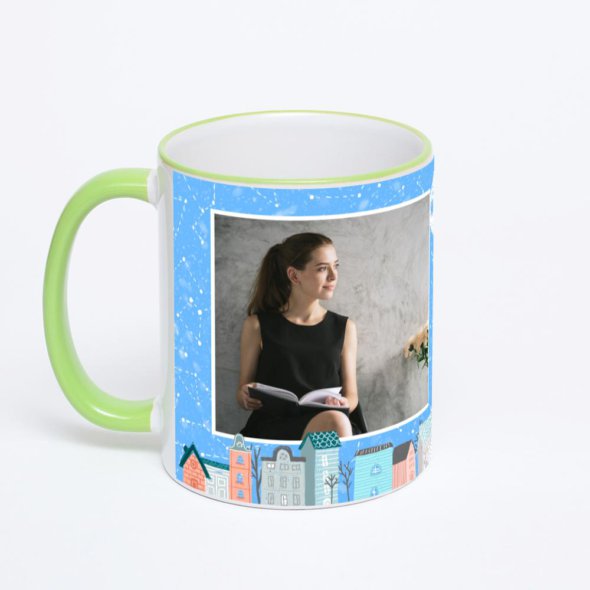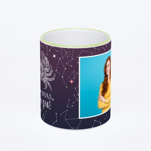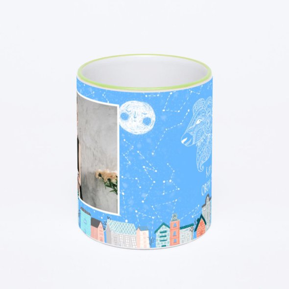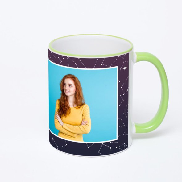 Керамическая кружка с салатовой ручкой и ободком с нанесением изображения. Кружка с вашим изображением – это уникальный и качественный подарок. Создать её вы можете прямо сейчас в редакторе, добавляя фотографии, стикеры и надписи.