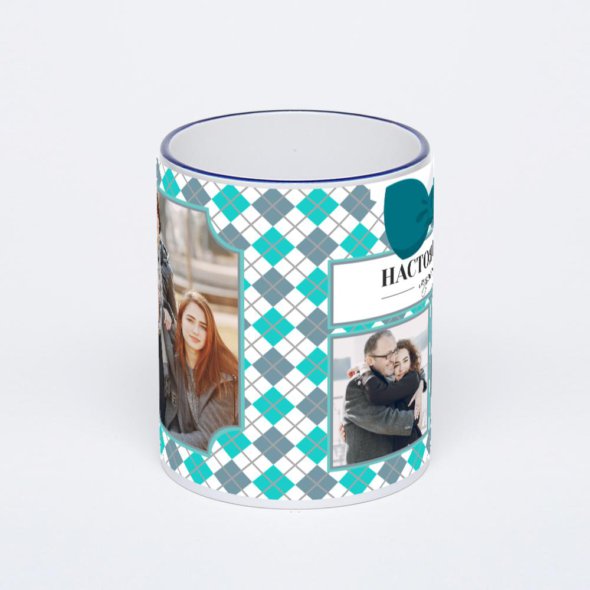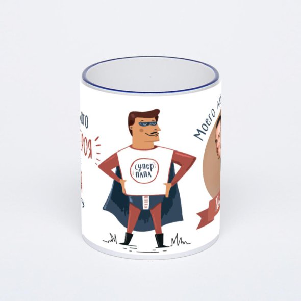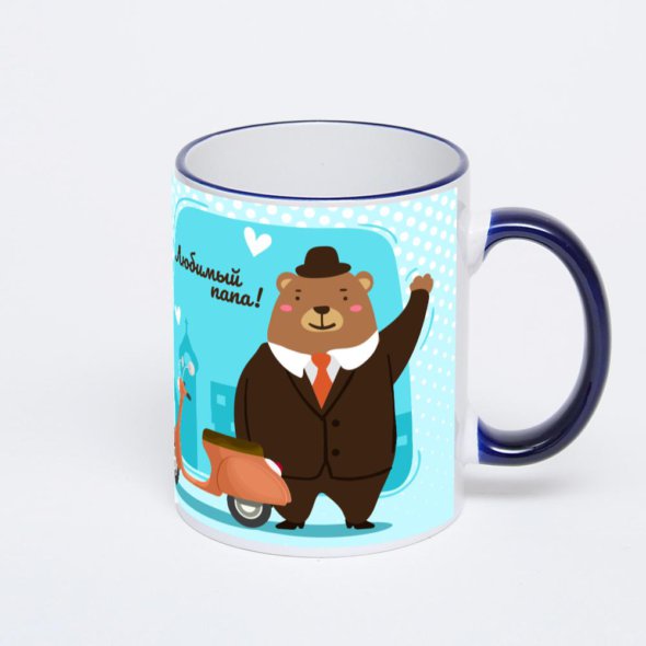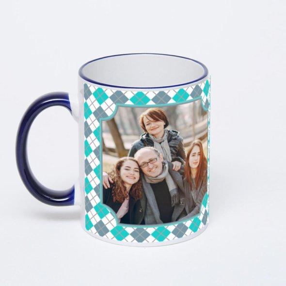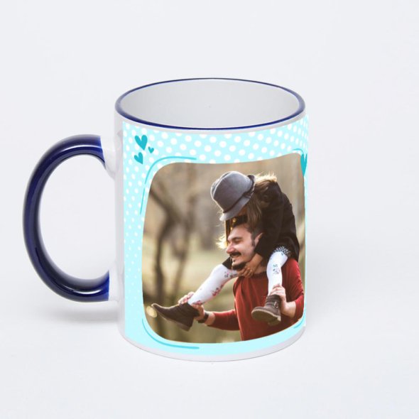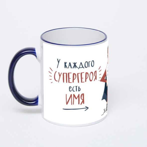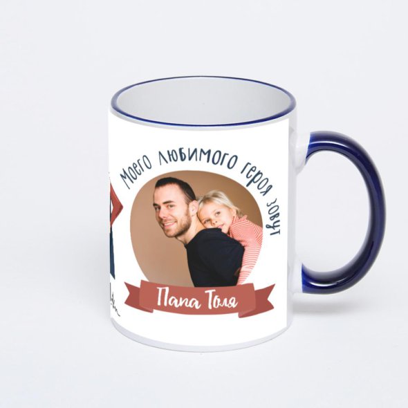 Керамическая кружка с тёмно-синей ручкой и ободком с нанесением изображения. Кружка с вашим изображением – это уникальный и качественный подарок. Создать её вы можете прямо сейчас в редакторе, добавляя фотографии, стикеры и надписи.