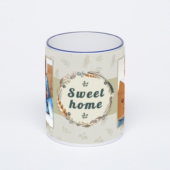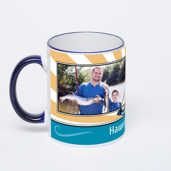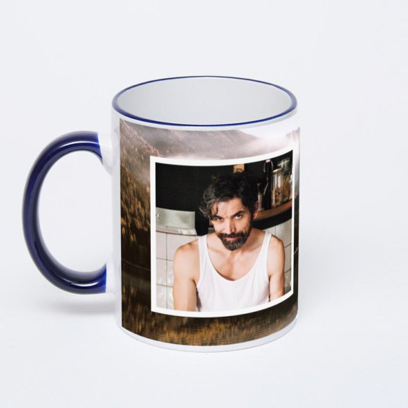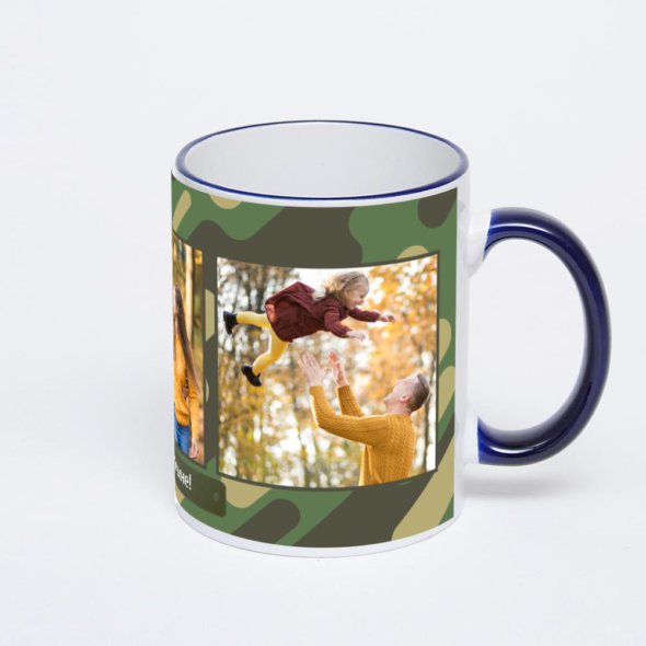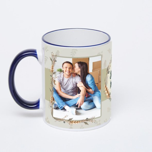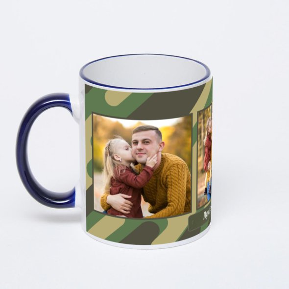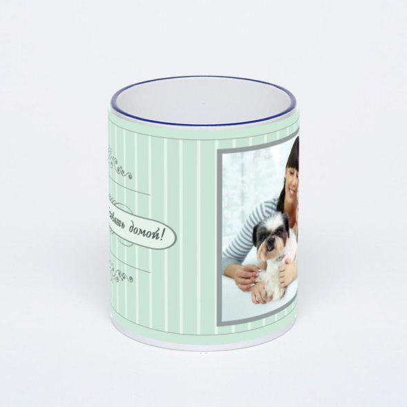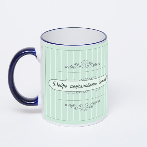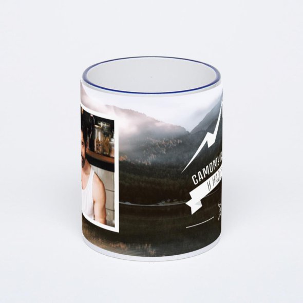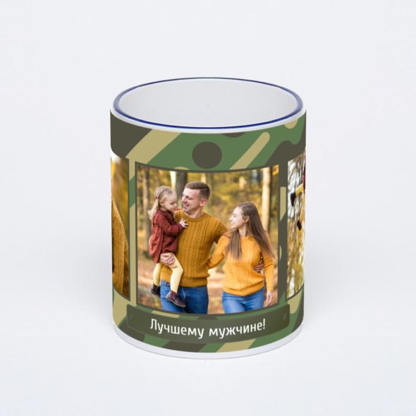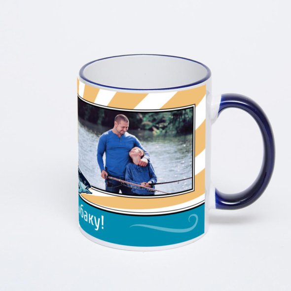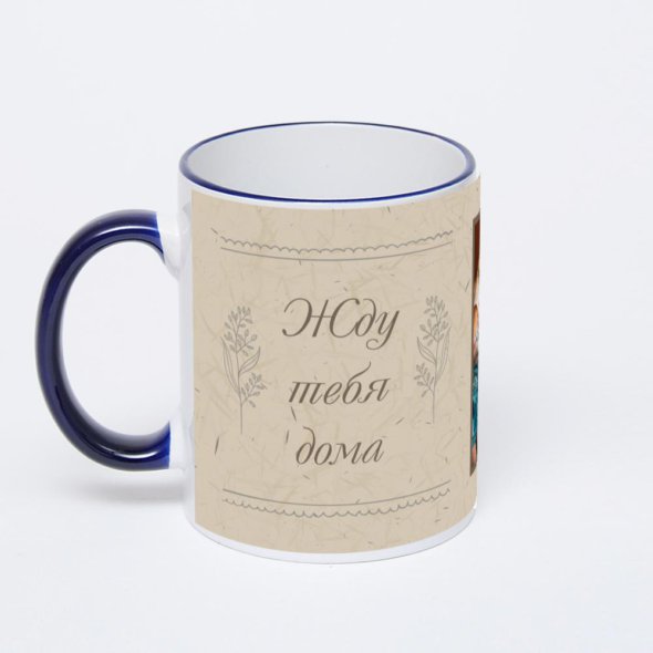 Керамическая кружка с тёмно-синей ручкой и ободком с нанесением изображения. Кружка с вашим изображением – это уникальный и качественный подарок. Создать её вы можете прямо сейчас в редакторе, добавляя фотографии, стикеры и надписи.