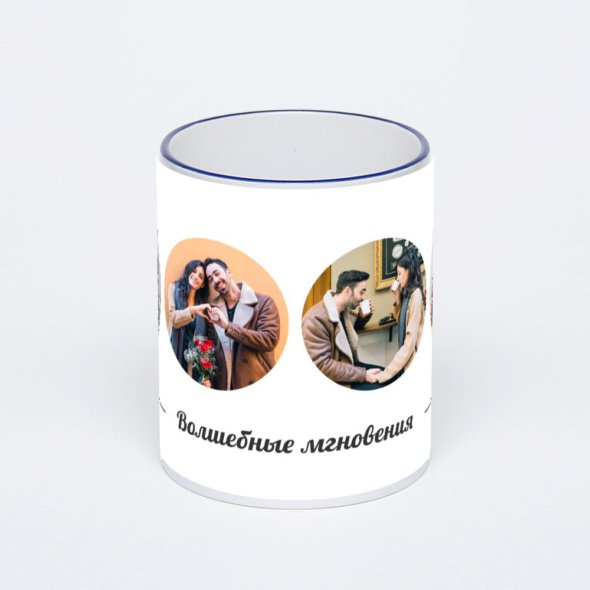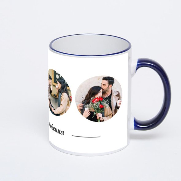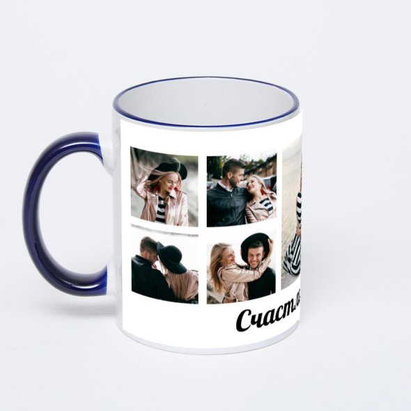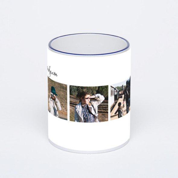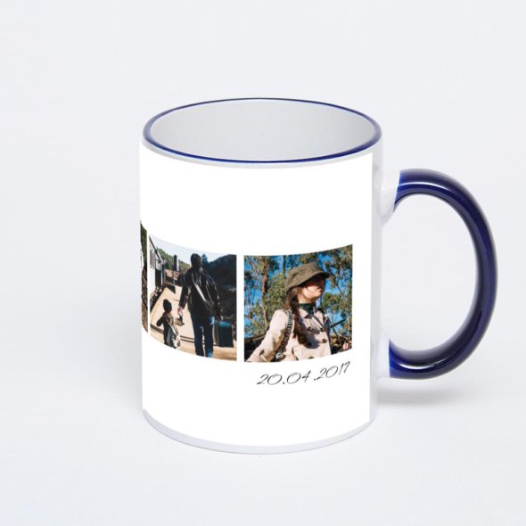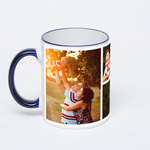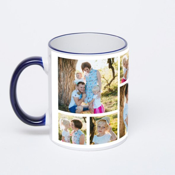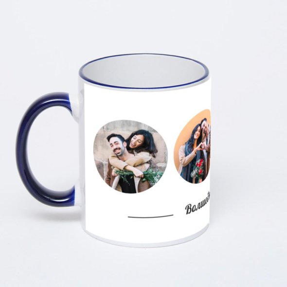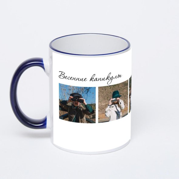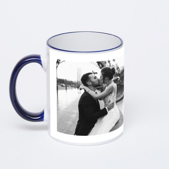 Керамическая кружка с тёмно-синей ручкой и ободком с нанесением изображения. Кружка с вашим изображением – это уникальный и качественный подарок. Создать её вы можете прямо сейчас в редакторе, добавляя фотографии, стикеры и надписи.