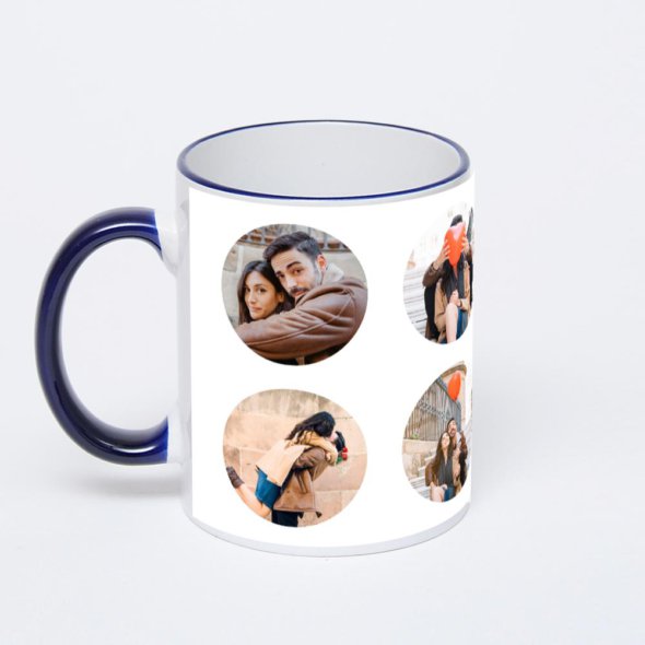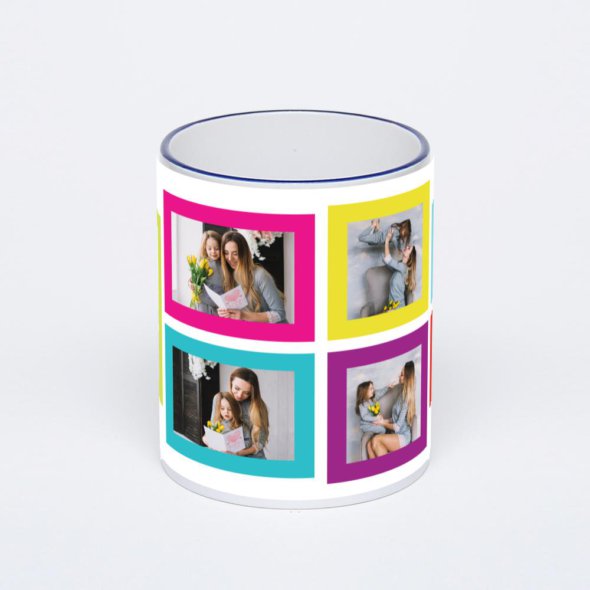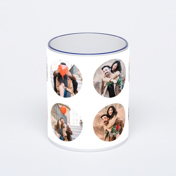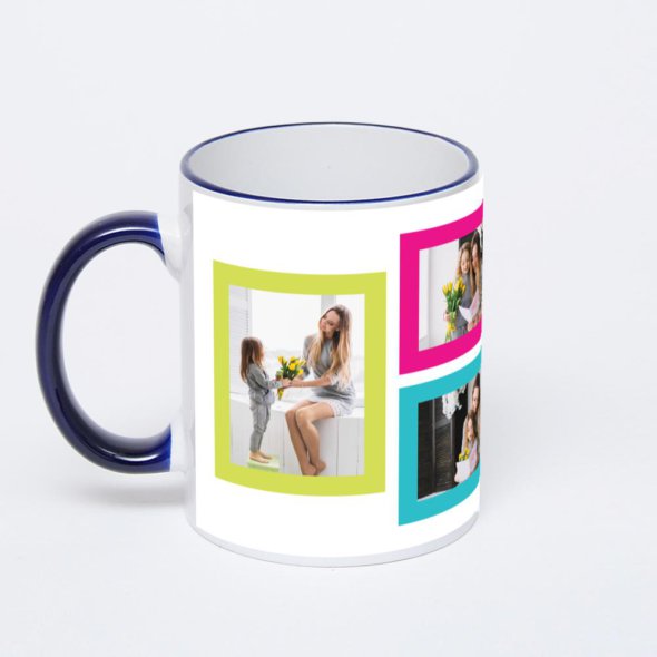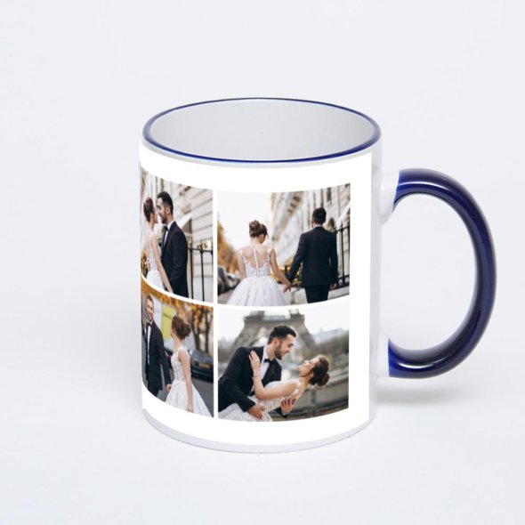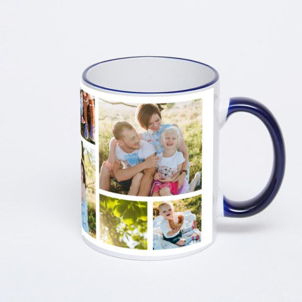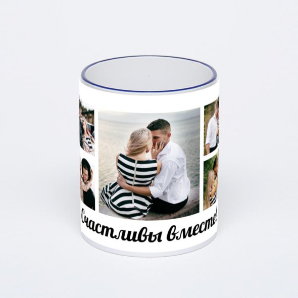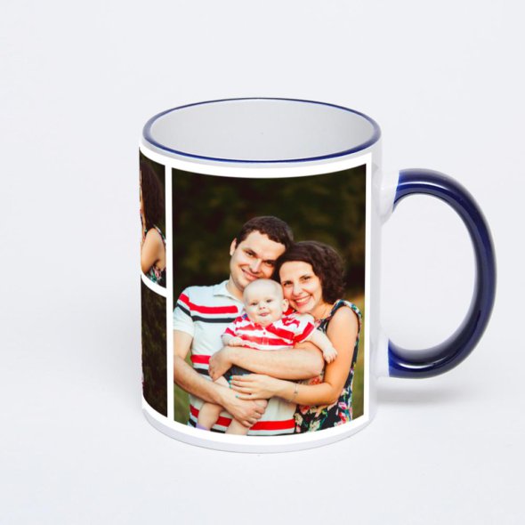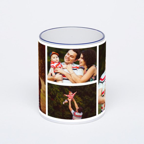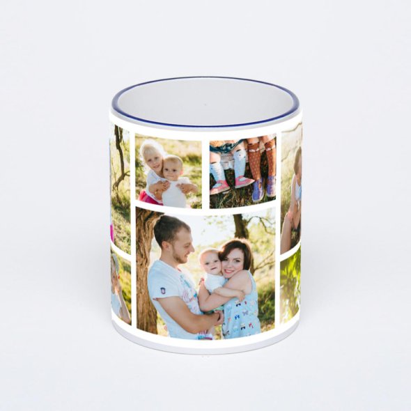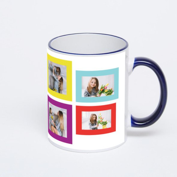 Керамическая кружка с тёмно-синей ручкой и ободком с нанесением изображения. Кружка с вашим изображением – это уникальный и качественный подарок. Создать её вы можете прямо сейчас в редакторе, добавляя фотографии, стикеры и надписи.