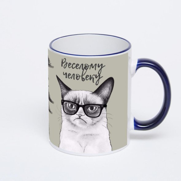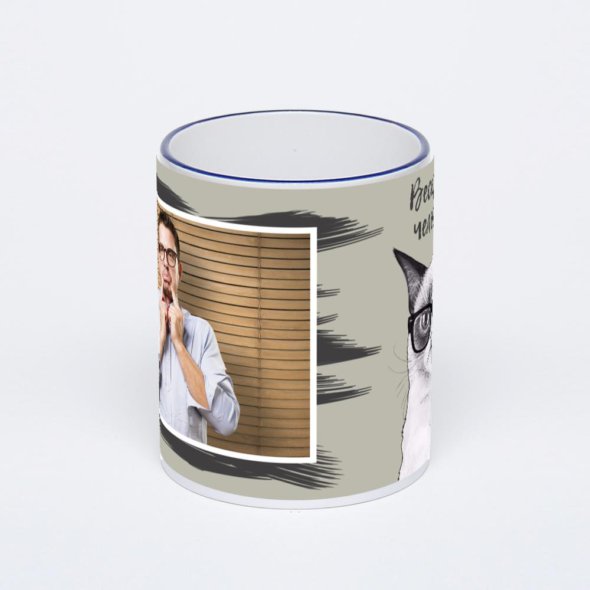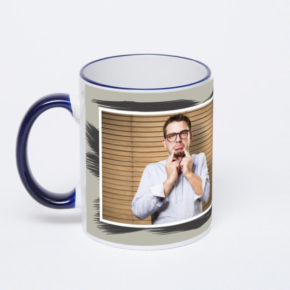 Керамическая кружка с тёмно-синей ручкой и ободком с нанесением изображения. Кружка с вашим изображением – это уникальный и качественный подарок. Создать её вы можете прямо сейчас в редакторе, добавляя фотографии, стикеры и надписи.