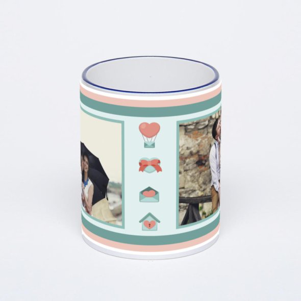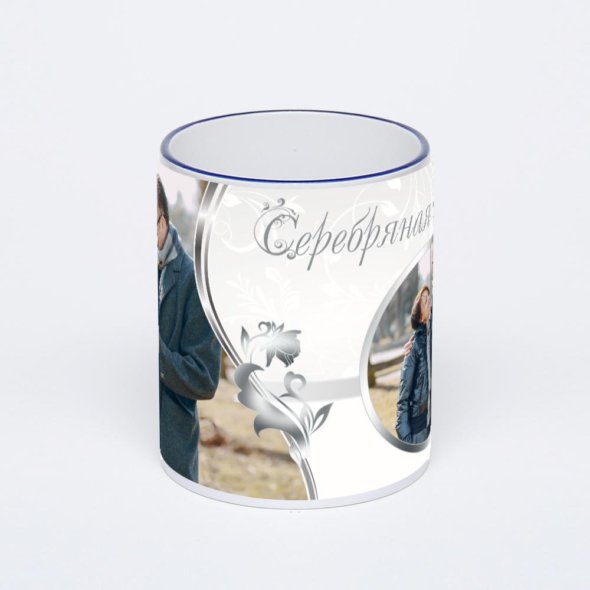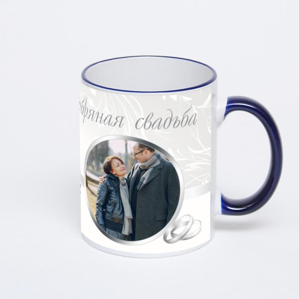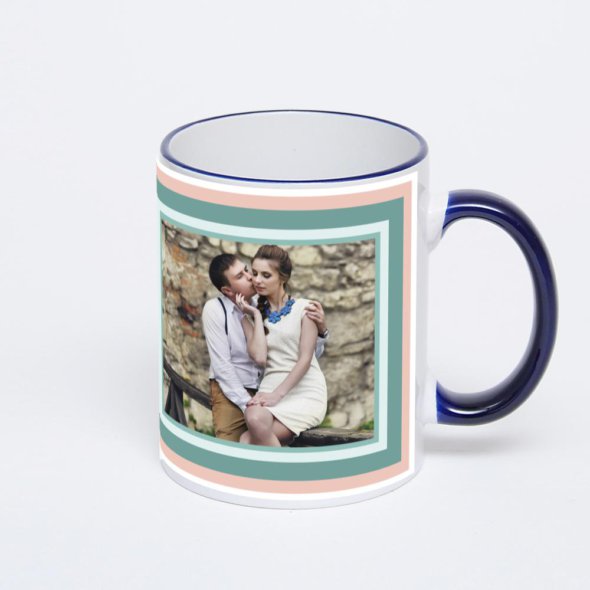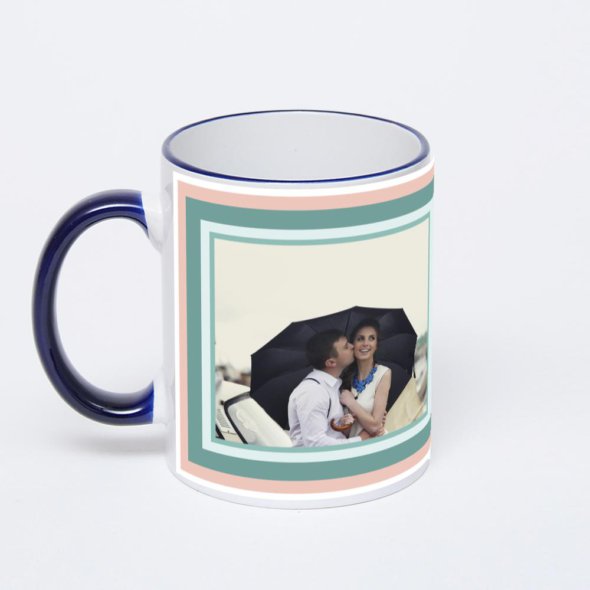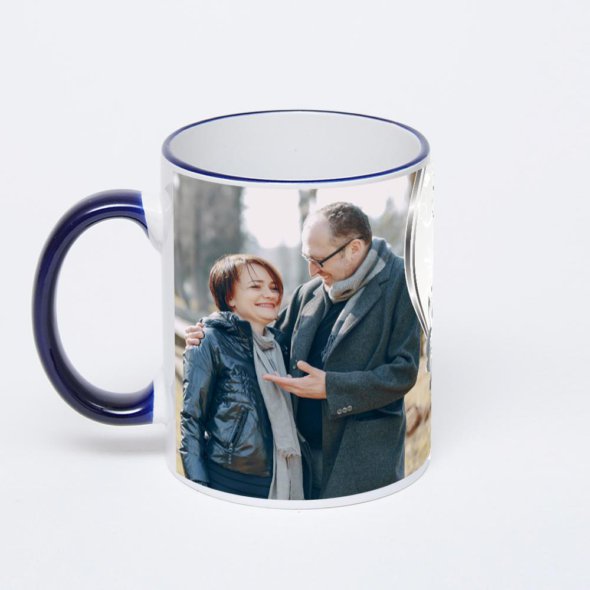 Керамическая кружка с тёмно-синей ручкой и ободком с нанесением изображения. Кружка с вашим изображением – это уникальный и качественный подарок. Создать её вы можете прямо сейчас в редакторе, добавляя фотографии, стикеры и надписи.