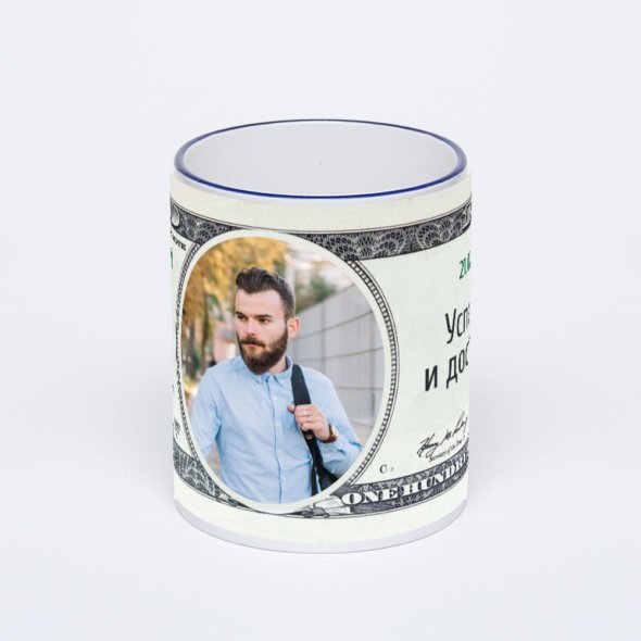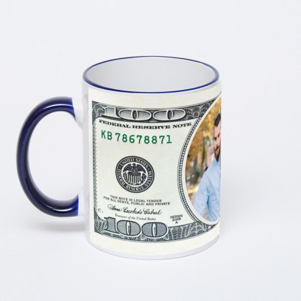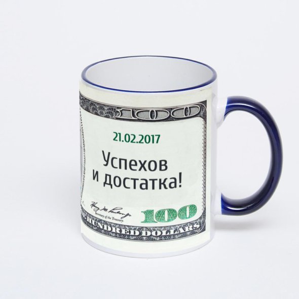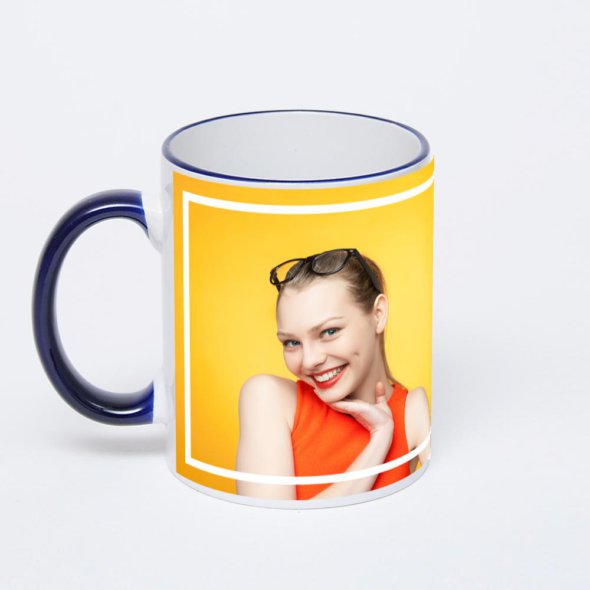 Керамическая кружка с тёмно-синей ручкой и ободком с нанесением изображения. Кружка с вашим изображением – это уникальный и качественный подарок. Создать её вы можете прямо сейчас в редакторе, добавляя фотографии, стикеры и надписи.