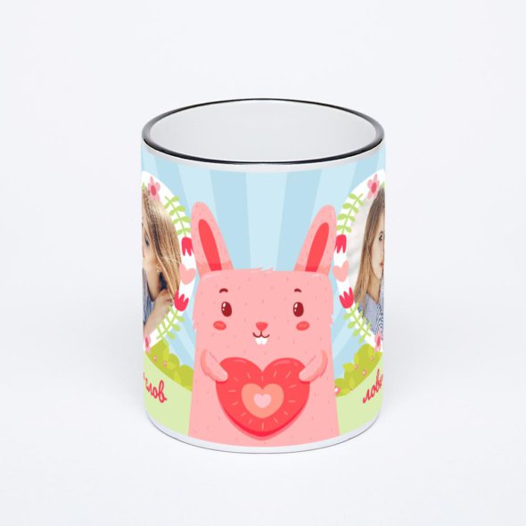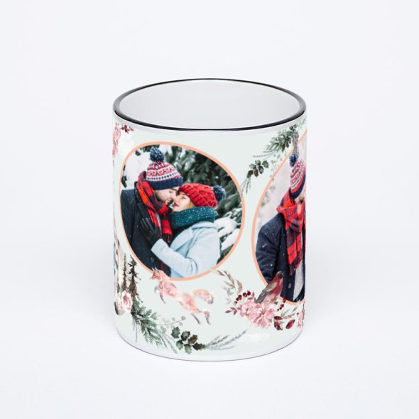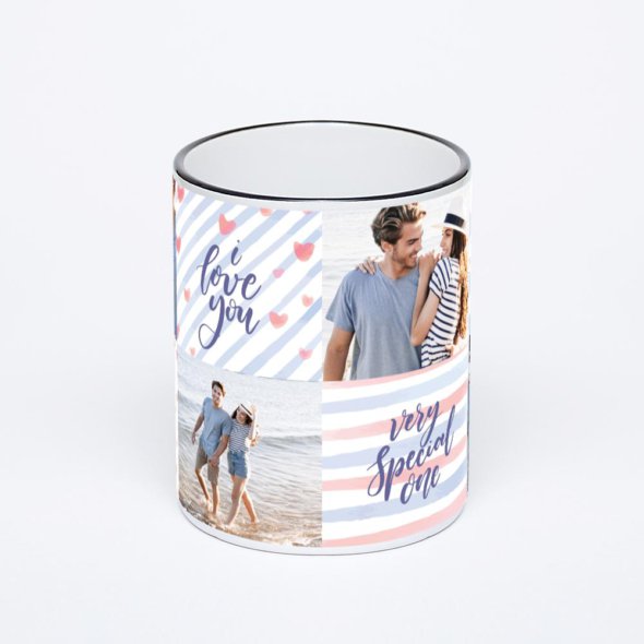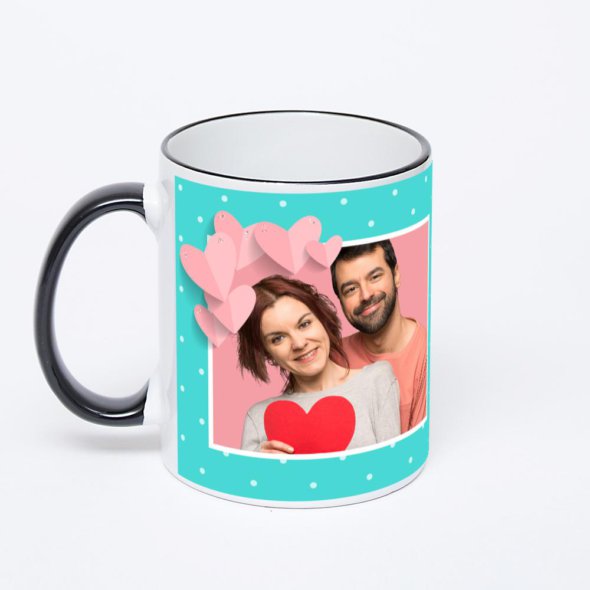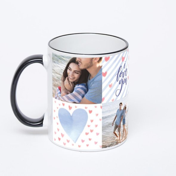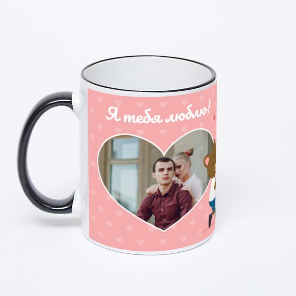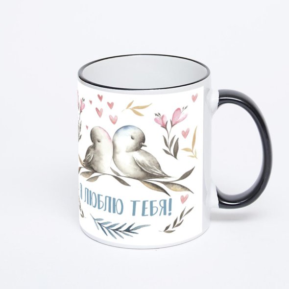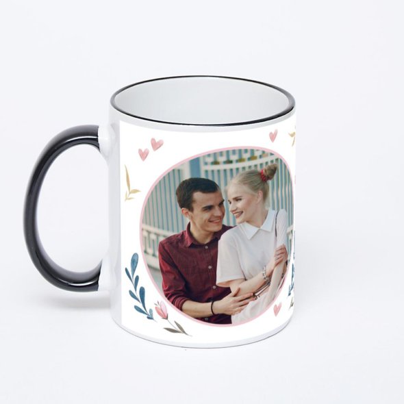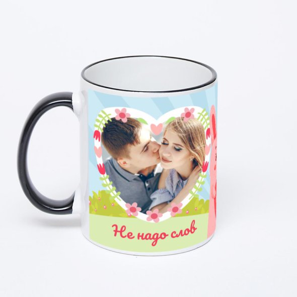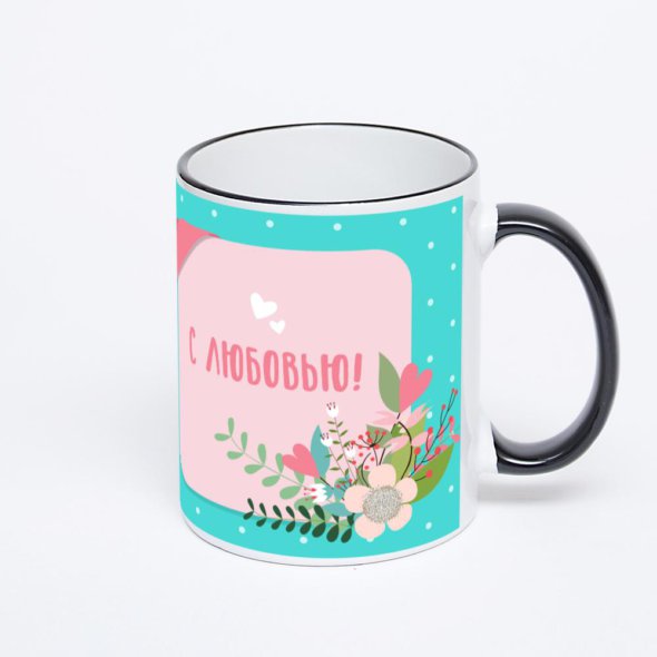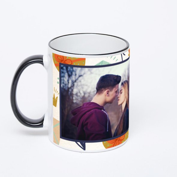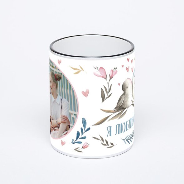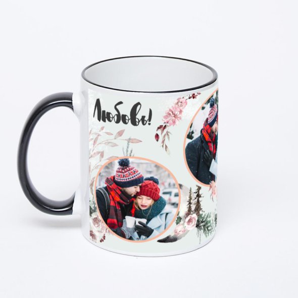 Керамическая кружка с черной ручкой и ободком с нанесением изображения. Кружка с вашим изображением – это уникальный и качественный подарок. Создать её вы можете прямо сейчас в редакторе, добавляя фотографии, стикеры и надписи.