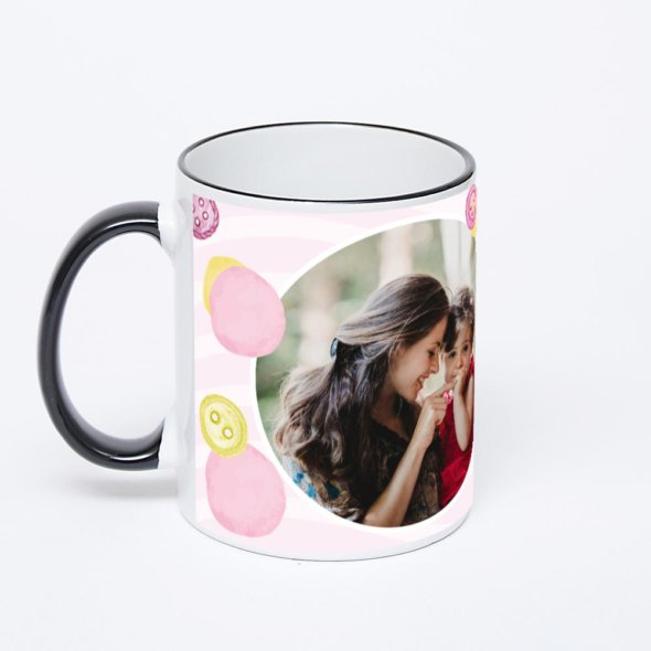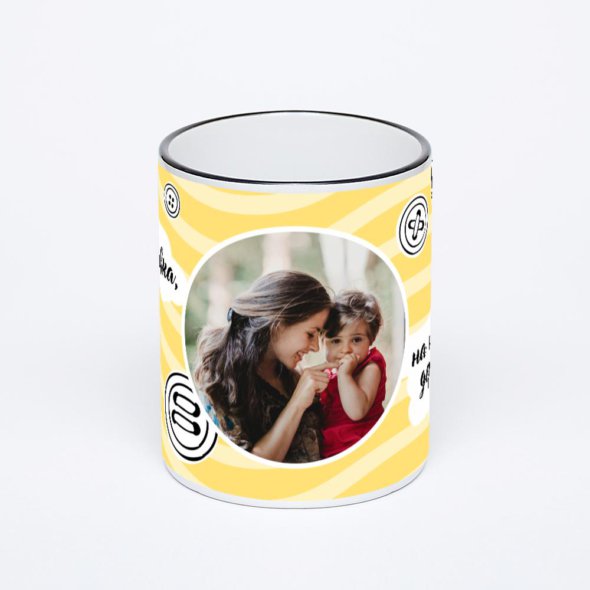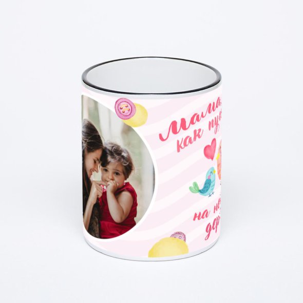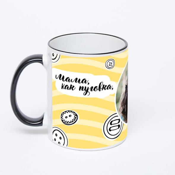 Керамическая кружка с черной ручкой и ободком с нанесением изображения. Кружка с вашим изображением – это уникальный и качественный подарок. Создать её вы можете прямо сейчас в редакторе, добавляя фотографии, стикеры и надписи.