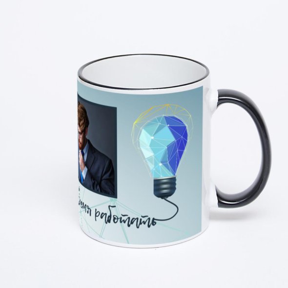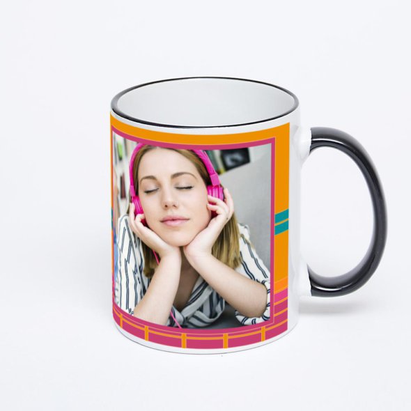 Керамическая кружка с черной ручкой и ободком с нанесением изображения. Кружка с вашим изображением – это уникальный и качественный подарок. Создать её вы можете прямо сейчас в редакторе, добавляя фотографии, стикеры и надписи.