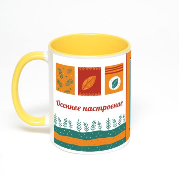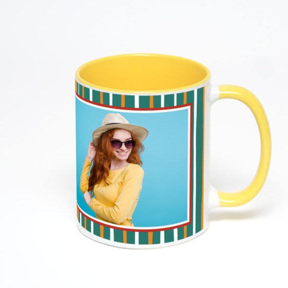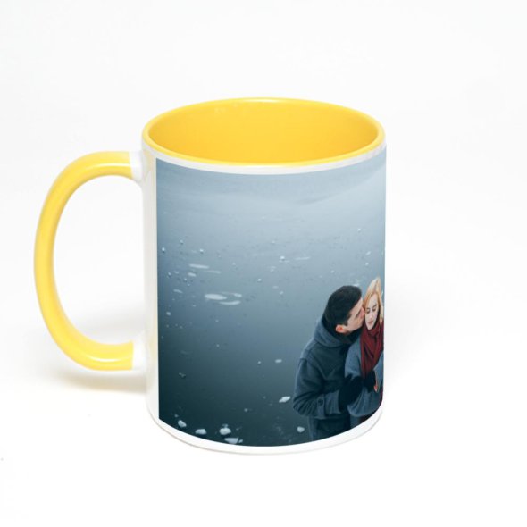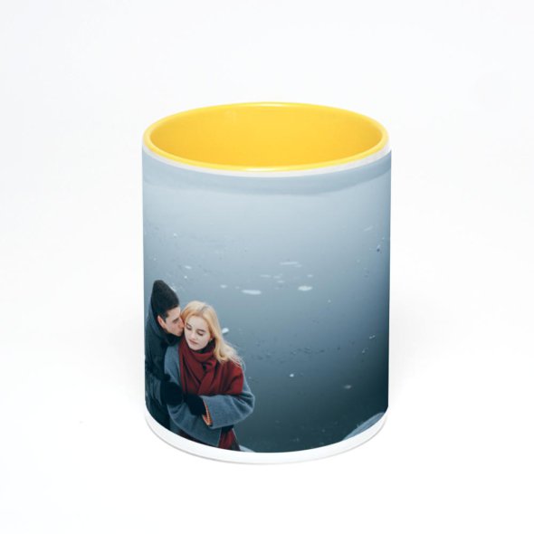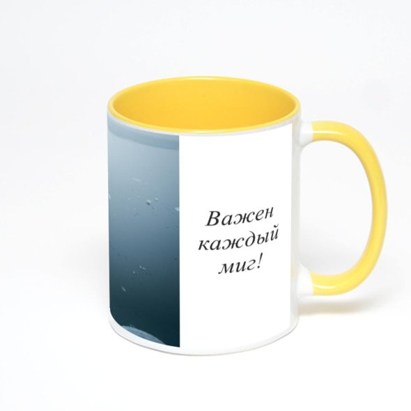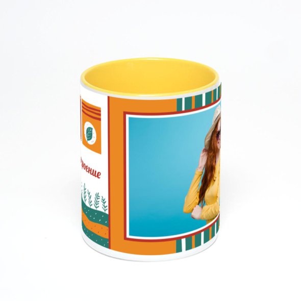 Керамическая кружка окрашенная желтым внутри с желтой ручкой с нанесением изображения. Кружка с вашим изображением – это уникальный и качественный подарок. Создать её вы можете прямо сейчас в редакторе, добавляя фотографии, стикеры и надписи.