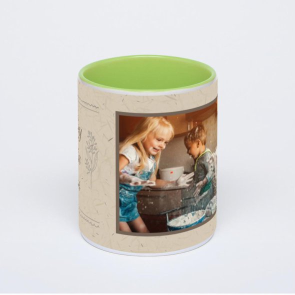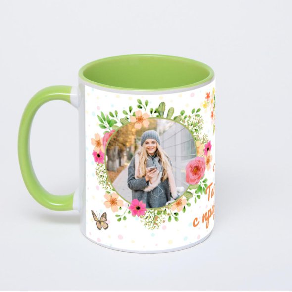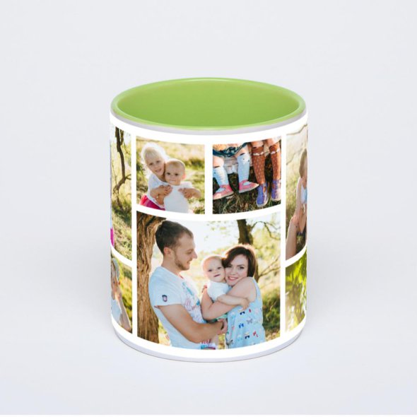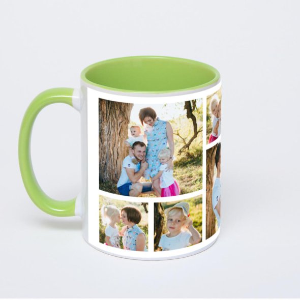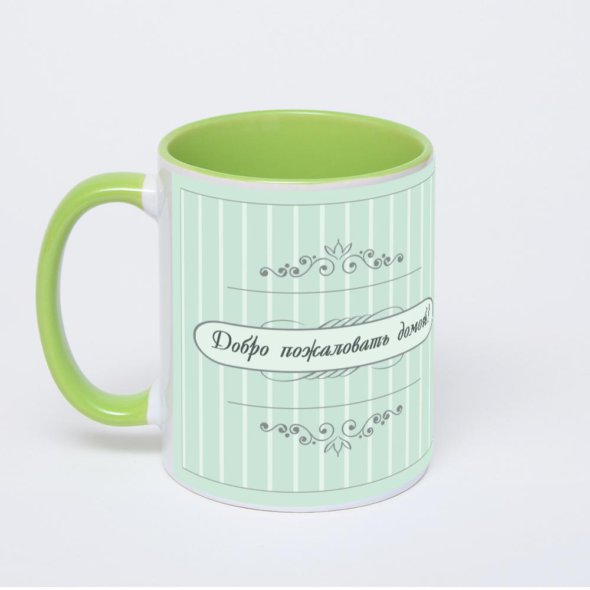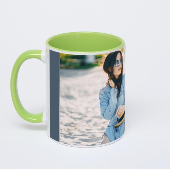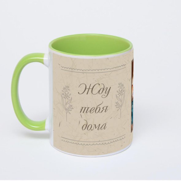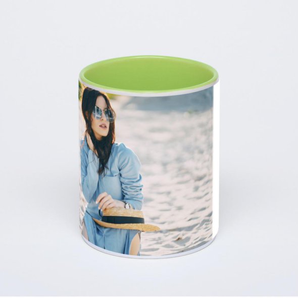 Керамическая кружка окрашенная салатовым внутри с салатовой ручкой с нанесением изображения. Кружка с вашим изображением – это уникальный и качественный подарок. Создать её вы можете прямо сейчас в редакторе, добавляя фотографии, стикеры и надписи.