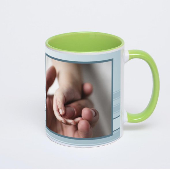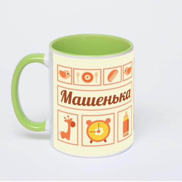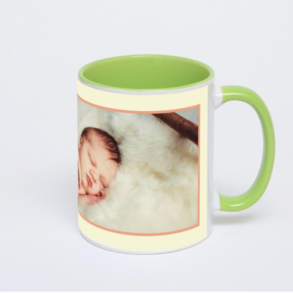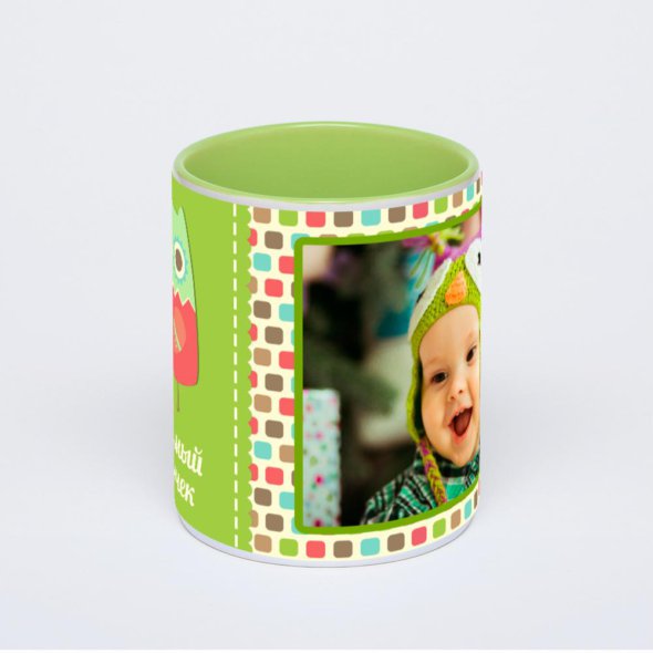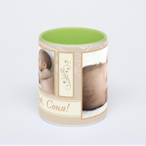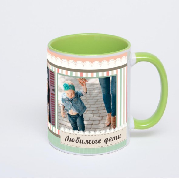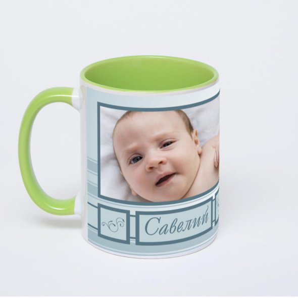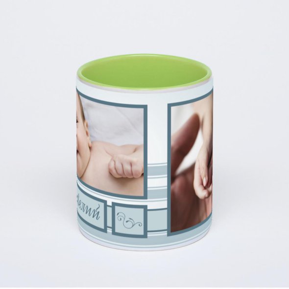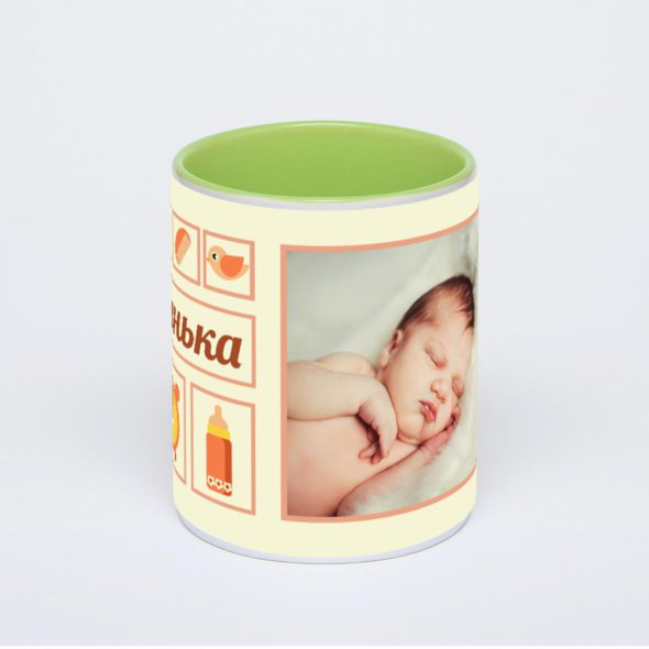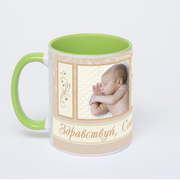 Керамическая кружка окрашенная салатовым внутри с салатовой ручкой с нанесением изображения. Кружка с вашим изображением – это уникальный и качественный подарок. Создать её вы можете прямо сейчас в редакторе, добавляя фотографии, стикеры и надписи.