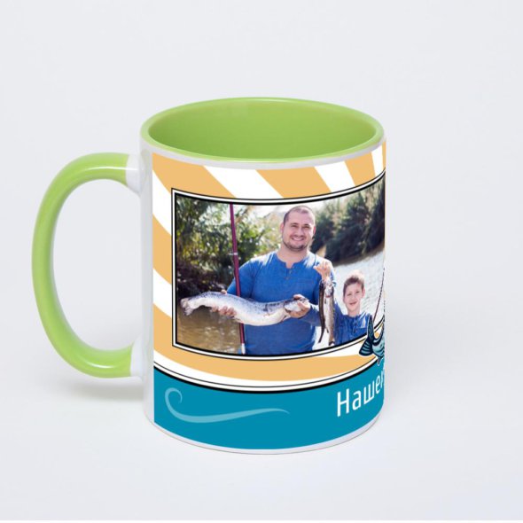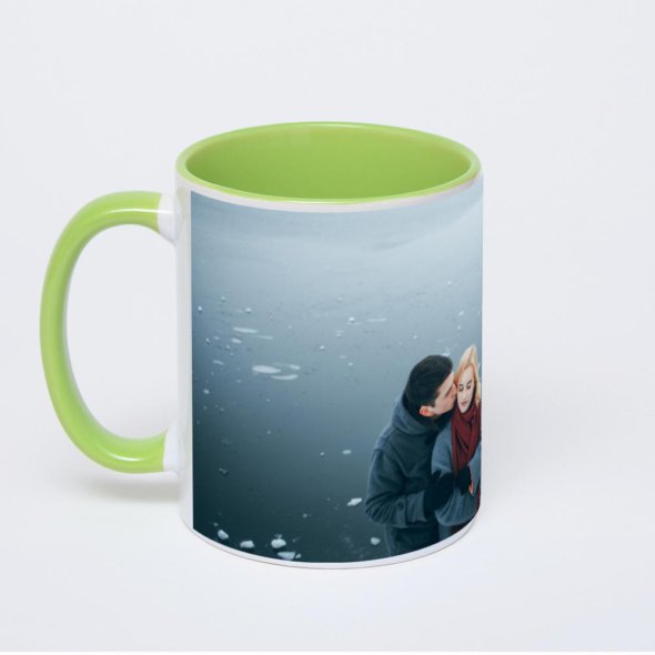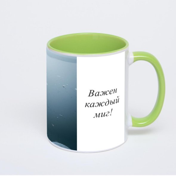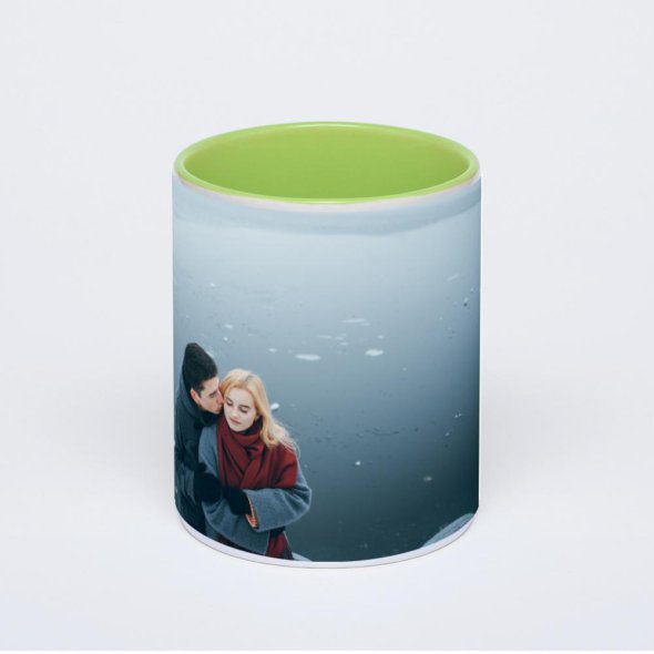 Керамическая кружка окрашенная салатовым внутри с салатовой ручкой с нанесением изображения. Кружка с вашим изображением – это уникальный и качественный подарок. Создать её вы можете прямо сейчас в редакторе, добавляя фотографии, стикеры и надписи.