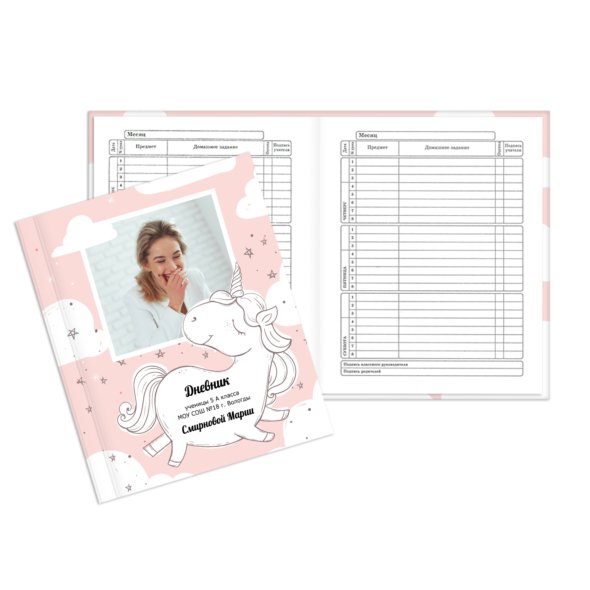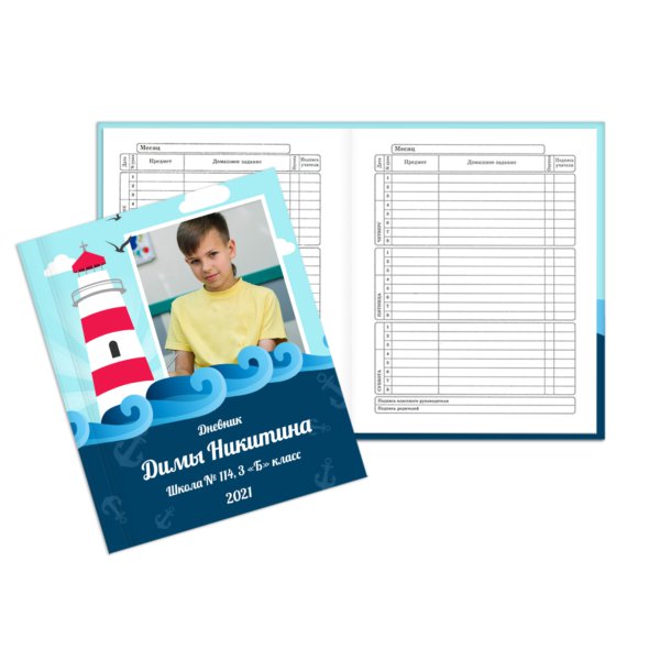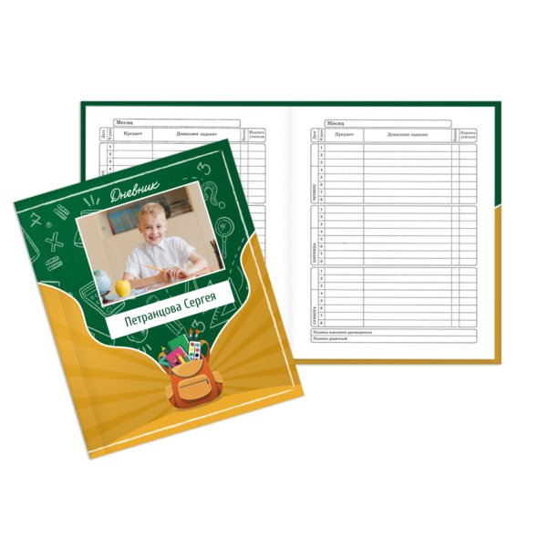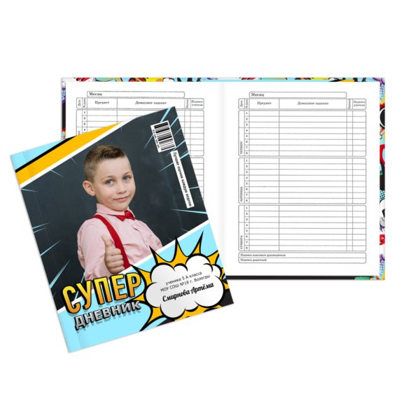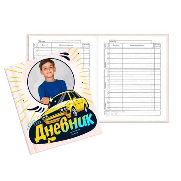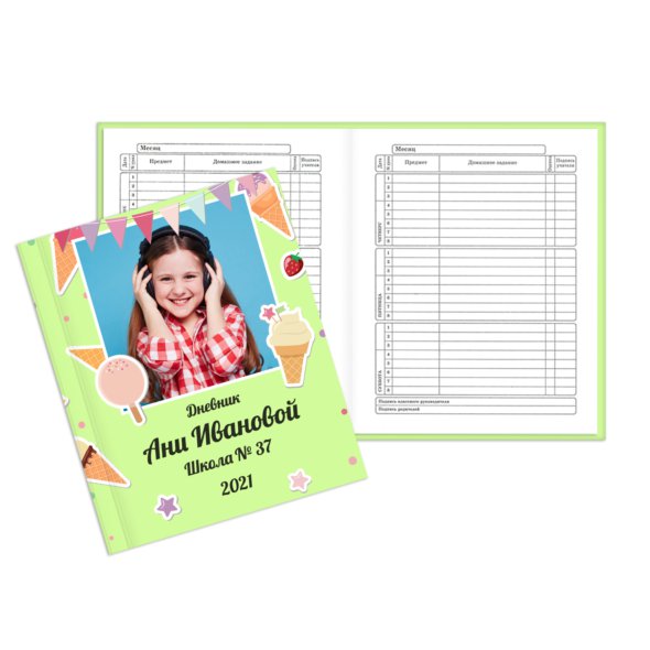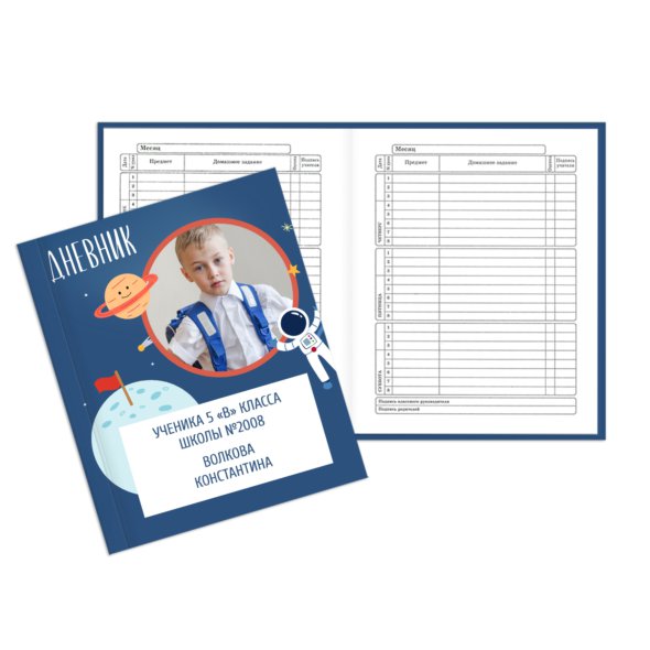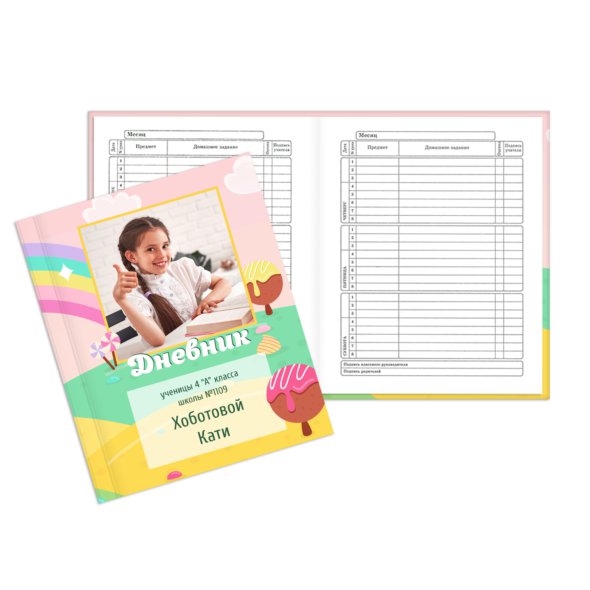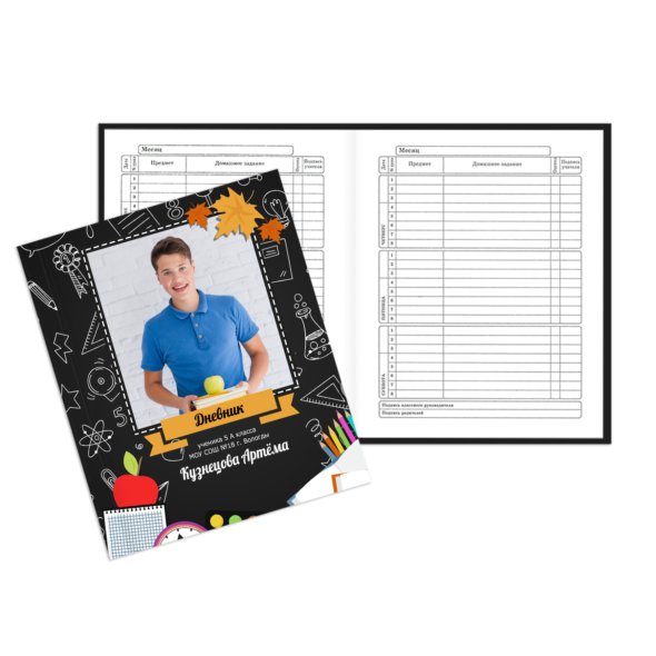 Школьный дневник в твёрдой обложке в глянцевой ламинации с вашими изображениями на обложке. Стандартный внутренний блок дневника на 40 страниц. Универсальное наполнение дневника подходит для старших и младших классов. Срок печати дневника – 2 рабочих дня.