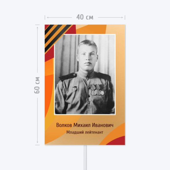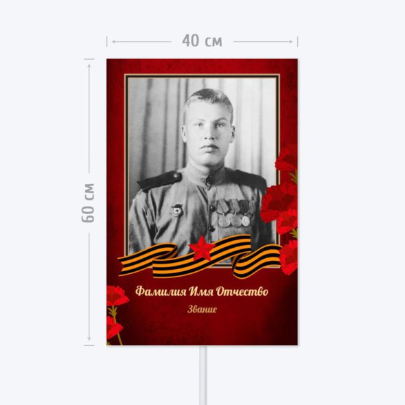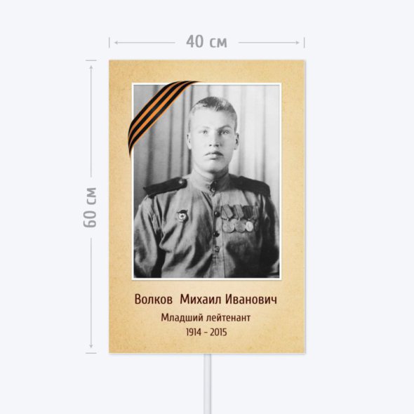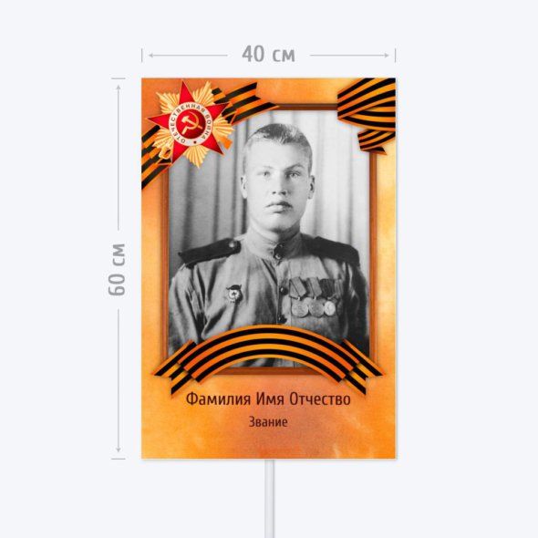 Печать транспаранта 40x60 см (формат А2 вертикальный) с деревянной ручкой для шествия «Бессмертного полка». Транспарант на пенокартоне очень лёгкий, но при этом твёрдый и не мнётся. Изображение устойчиво к погодным условиям благодаря ламинации. Для заказа загрузите фотографию и замените текст на свой. Ваш заказ на транспарант «Бессмертный полк» поступит в печать только после согласования с вами по электронной почте, при необходимости вы сможете внести правки. Срок изготовления – 2 рабочих дня.