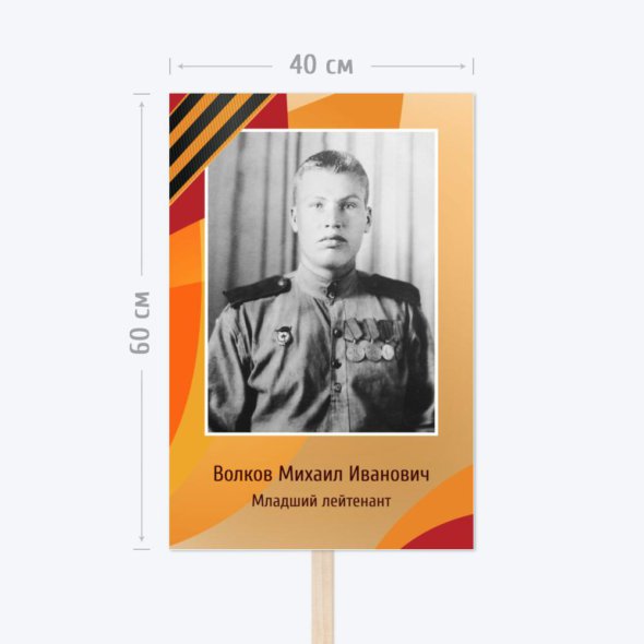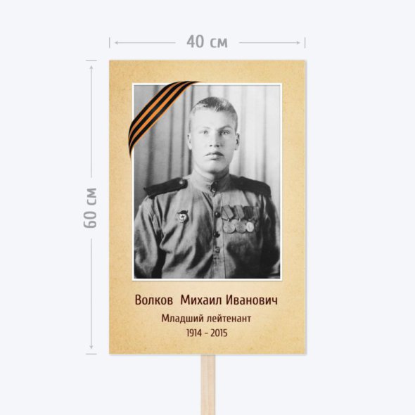 Печать транспаранта 40x60 см (формат А2 вертикальный) с деревянной ручкой для шествия «Бессмертного полка». Транспарант на пенокартоне очень лёгкий, но при этом твёрдый и не мнётся. Изображение устойчиво к погодным условиям благодаря ламинации. Для заказа загрузите фотографию и замените текст на свой. Ваш заказ на транспарант «Бессмертный полк» поступит в печать только после согласования с вами по Whatsapp или электронной почте, при необходимости вы сможете внести правки. Срок изготовления – 2 рабочих дня.
