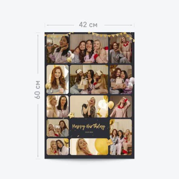 Напечатайте постер-коллаж в формате А2 размером 42x60 см с загрузкой фотографий. В онлайн редакторе вы можете загрузить фотографии, добавить фон, стикеры и текст. Печать постера-коллажа производится на профессиональной шелковой фотобумаге.