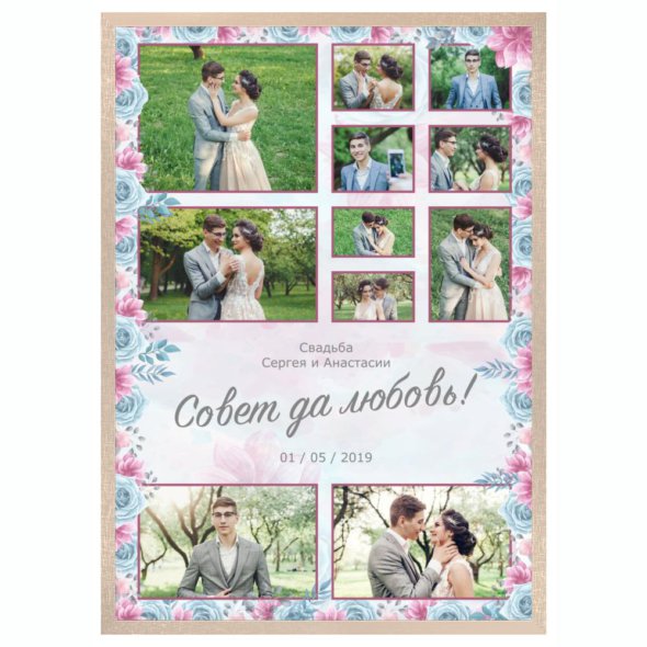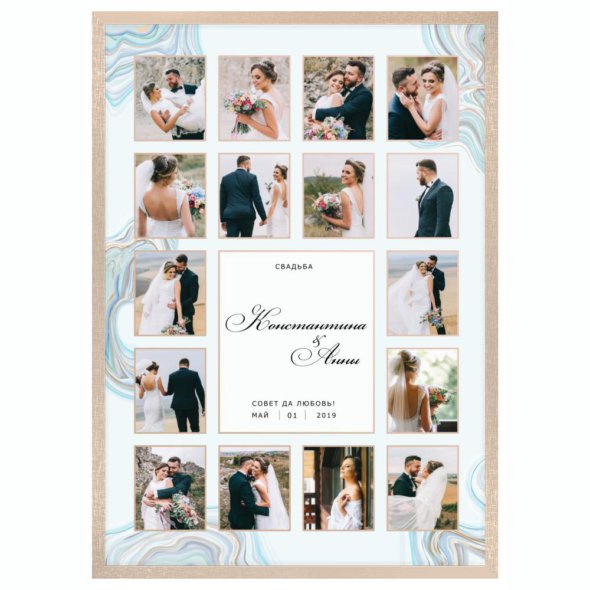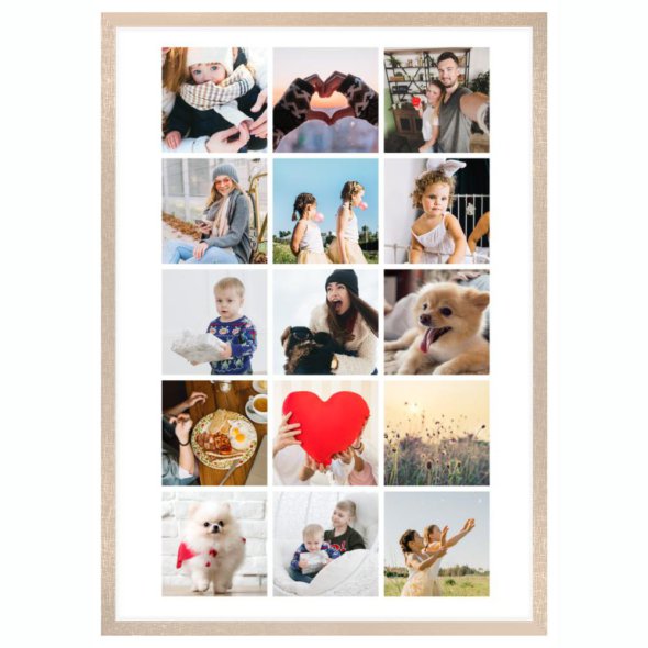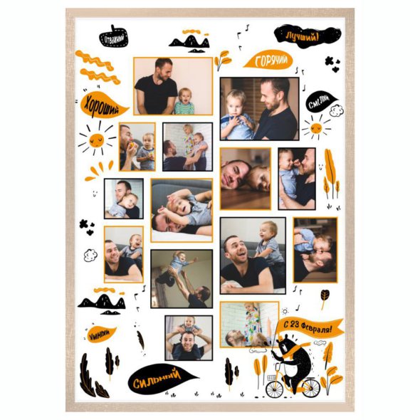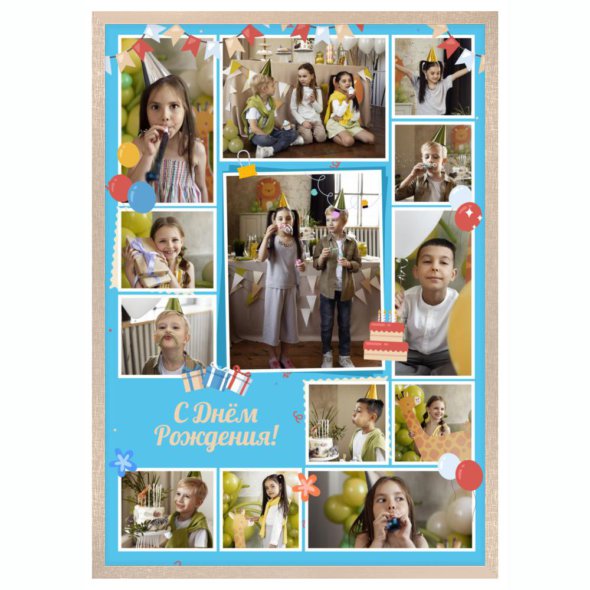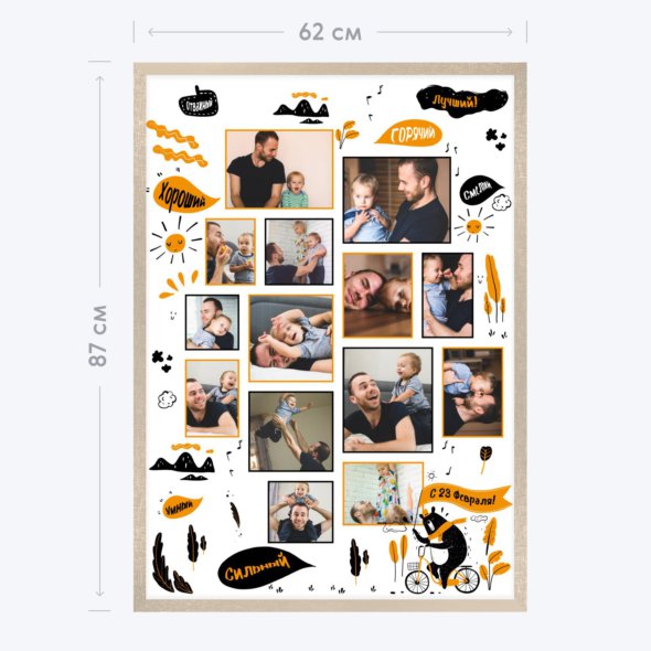 Печать вертикального коллажа 62х87 см в бежево-золотистой рамке позволяет разместить сразу много фотографий в единой стильной рамке. Загрузите файлы, добавьте ваши надписи-поздравления и украсьте коллаж запоминающимися стикерами! Срок изготовления – 1 рабочий день.