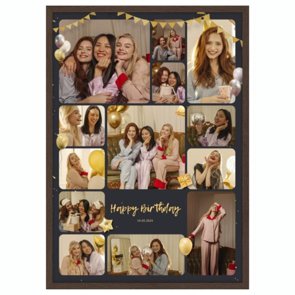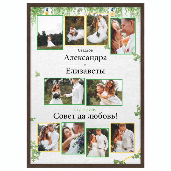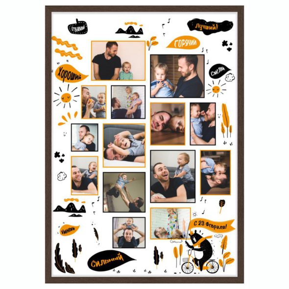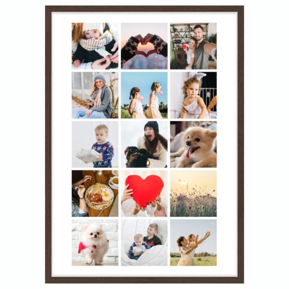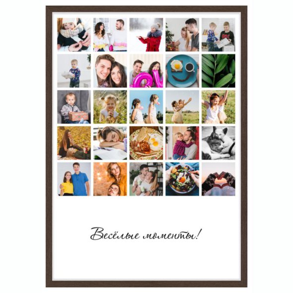 Печать вертикального коллажа 62х87 см в рамке цвета венге позволяет разместить сразу много фотографий в единой стильной рамке. Загрузите файлы, добавьте ваши надписи-поздравления и украсьте коллаж запоминающимися стикерами! Срок изготовления – 1 рабочий день.